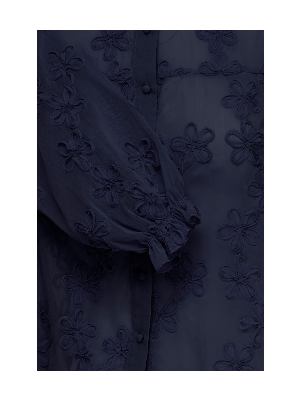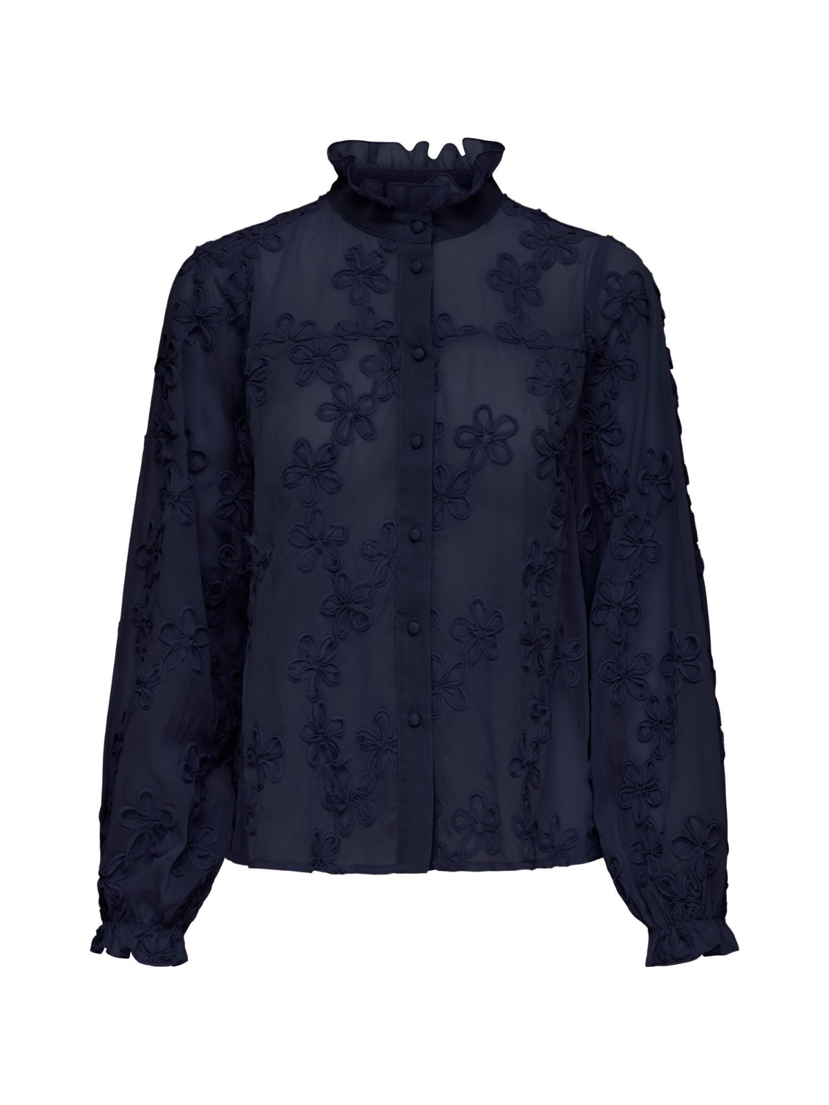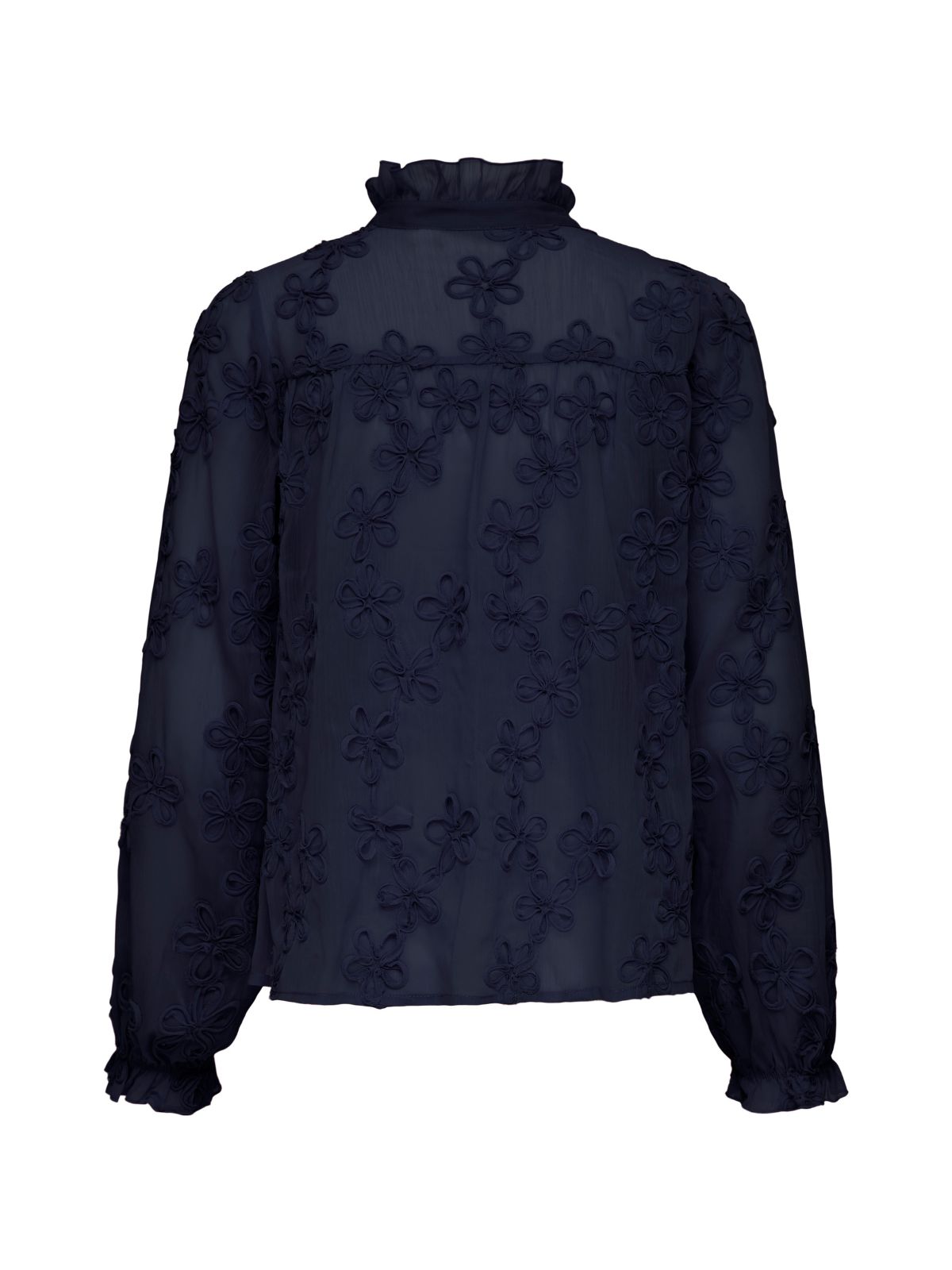 Smuk skjorte med blomsterbroderinger fra Pulz Jeans. Skjorten har knaplukning langs fronten, høj krave og lange ærmer.Materiale: 100% Polyester