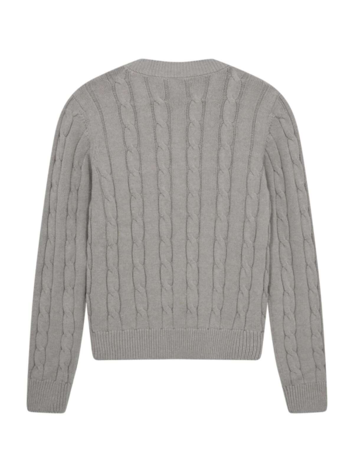 Eksklusiv kabelstrikket pullover med lange ærmer og V-udskæring. Pulloveren har ribkanter og er afsluttet med en diskret broderet logodetalje på brystet, hvilket giver et tidløst og stilfuldt udtryk.