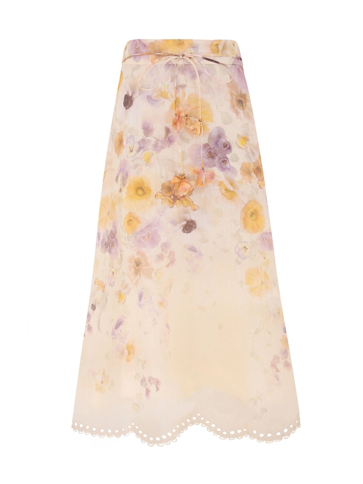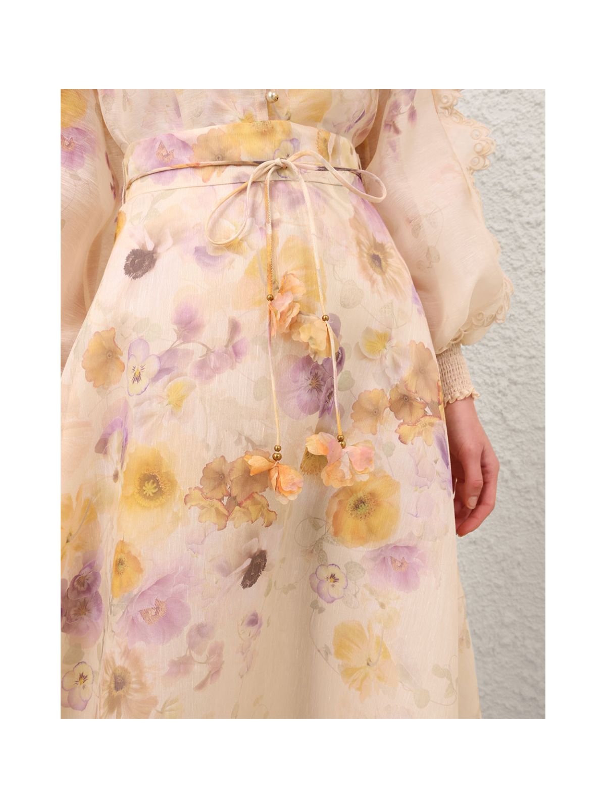 Smuk nederdel fra Zimmermann. Nederdelen er en feminin og elegant nederdel i silk linen organza. Den høje talje og faste linning giver et smukt snit, mens det aftagelige 3D-blomsterbælte tilfører et unikt og romantisk udtryk. Nederdelen har et fyldigt fald med flot bevægelse, afsluttet med en broderet bølgekant, der understreger det håndværksmæssige detaljeniveau. Den lukkes med en usynlig lynlås bagpå og er fuldt foret for komfort og et eksklusivt finish.Materiale: 53% Hør, 47% Silke | Foring: 100% Viskose