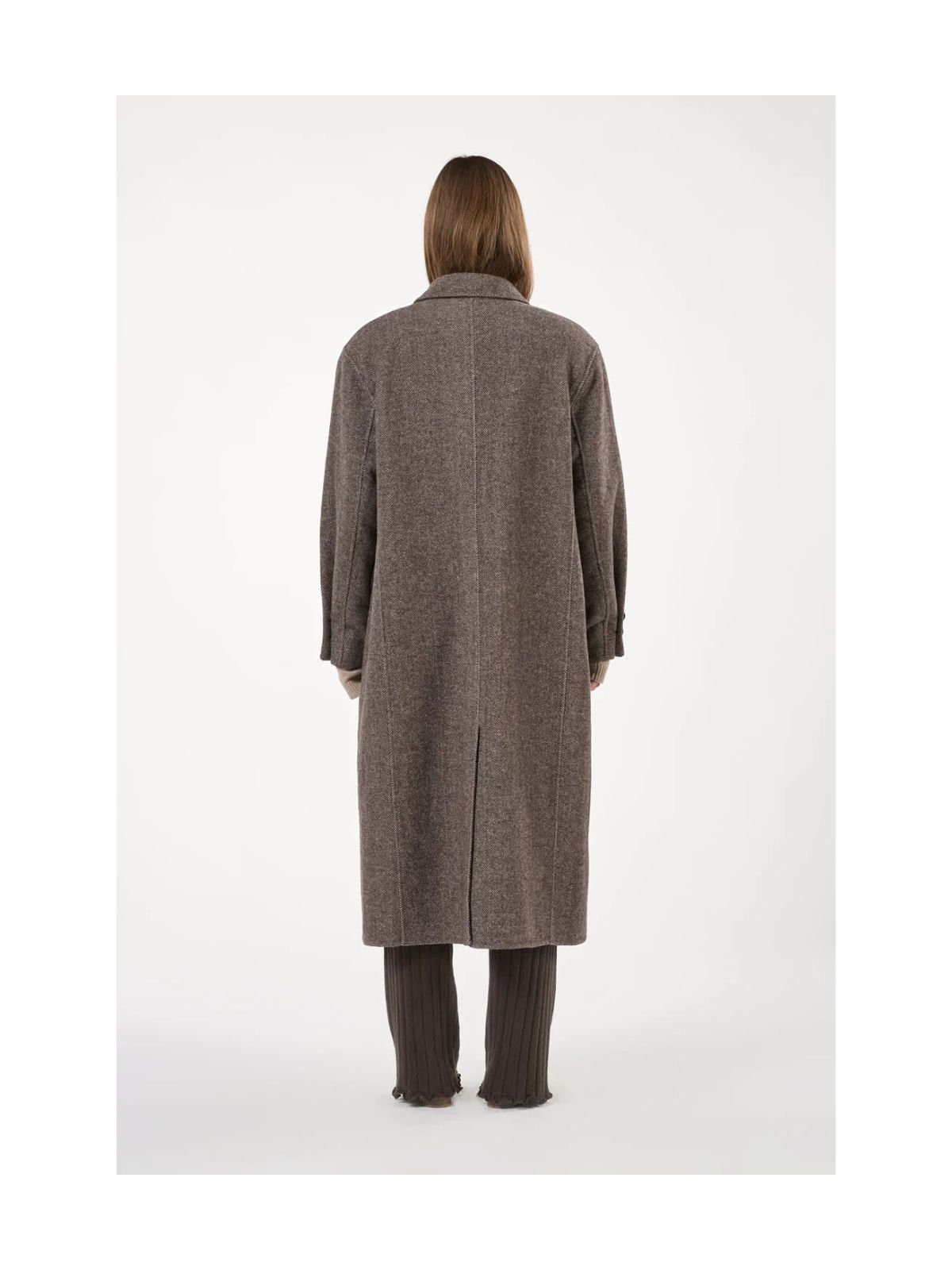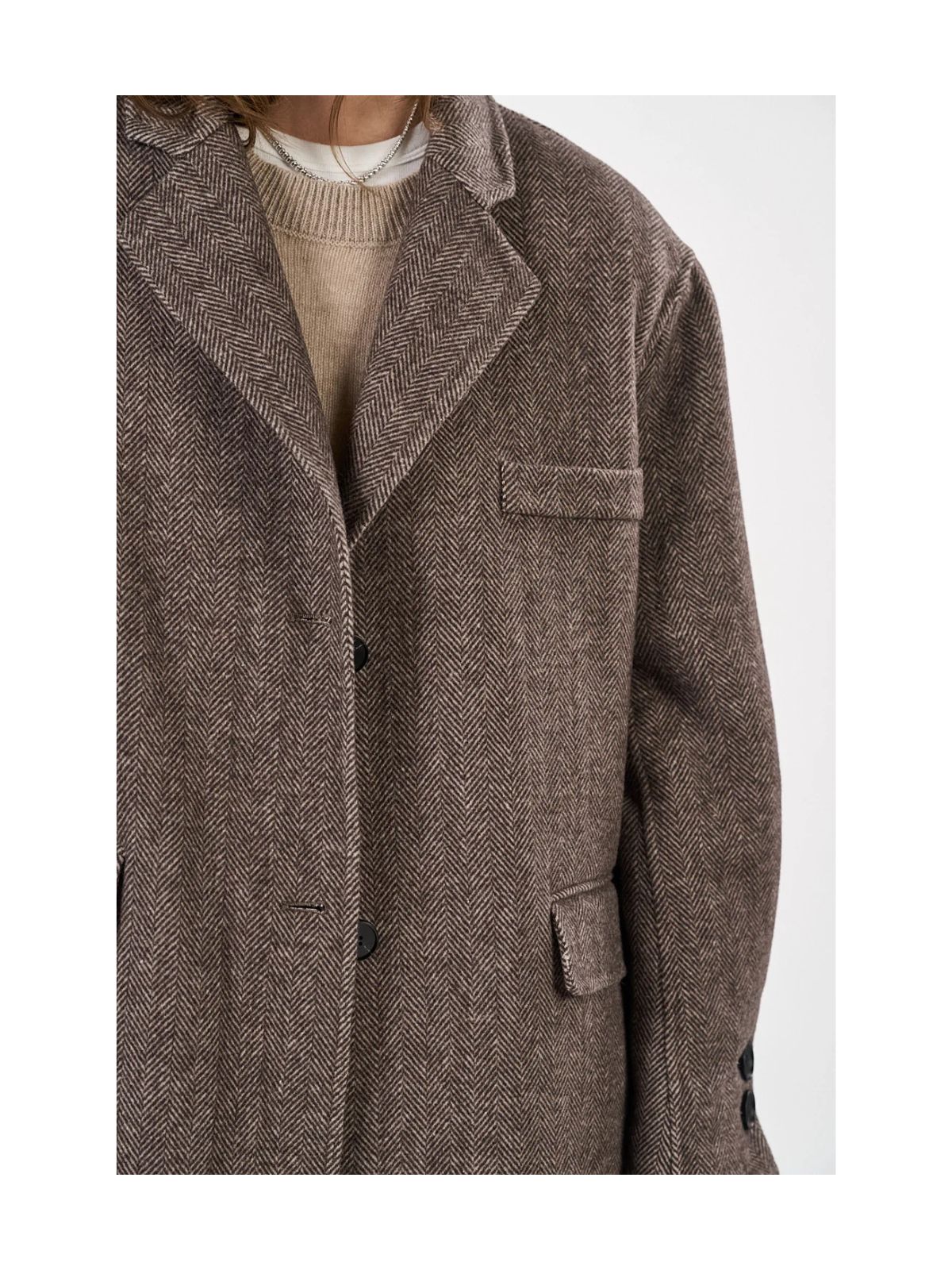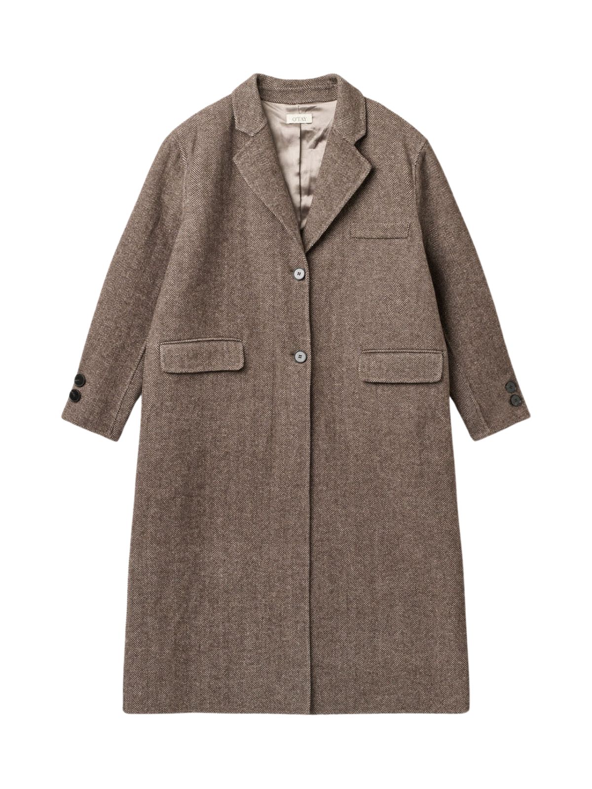 En lang, klassisk uldfrakke i en varm og slidstærk kvalitet med diskret sildebensmønster, der tilfører dybde til det elegante design. Frakken har rummelige sidelommer, en dekorativ brystlomme, slids bagpå samt knaplukning foran og ved ærmerne. Et tidløst valg, der kombinerer komfort, stil og alsidighed til både hverdag og formelle lejligheder.Materiale: 60% Uld, 40% Polyester | Foer: 100% Polyester