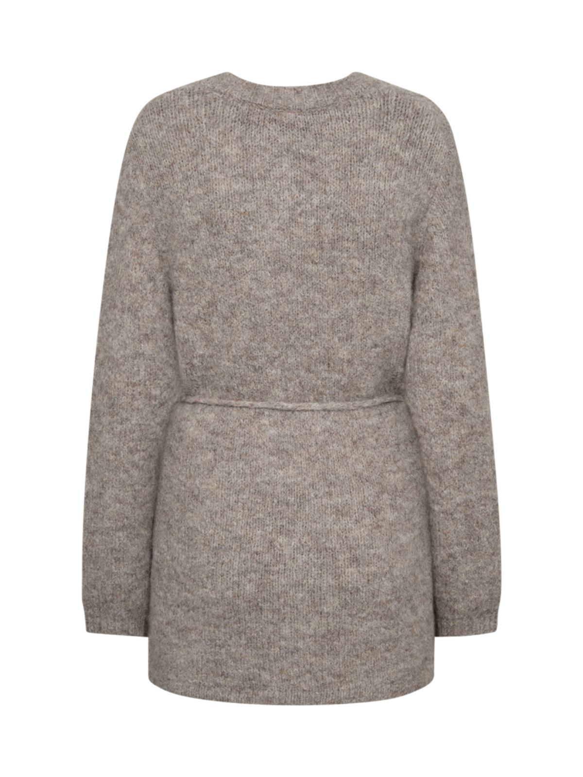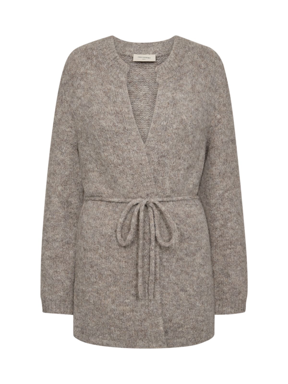 Feminin cardigan fra Freequent. Cardiganen har åben på fronten, har lange ærmer og lukkes med bindebånd i taljen. Et must i efterårs/vinter garderoben!Materiale: 59% Genanvendt polyester, 21% Polyamid, 11% Polyester, 8% uld, 1% elastan