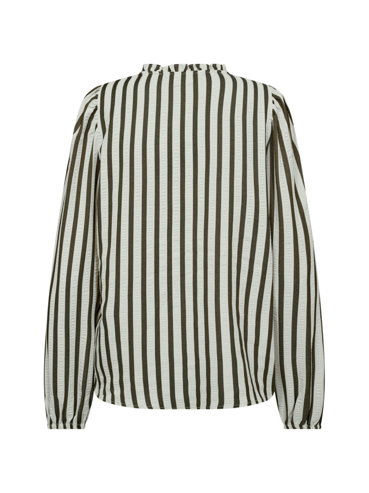 Stribet bluse fra Freequent. Blusen har en halv knaplukning på fronten med flæsekant, samt flæsekant ved kraven. Derudover har blusen lange ærmer med elastik i enden, som giver en smule ballon effekt.Materiale: 50% Bomuld, 50% Polyester