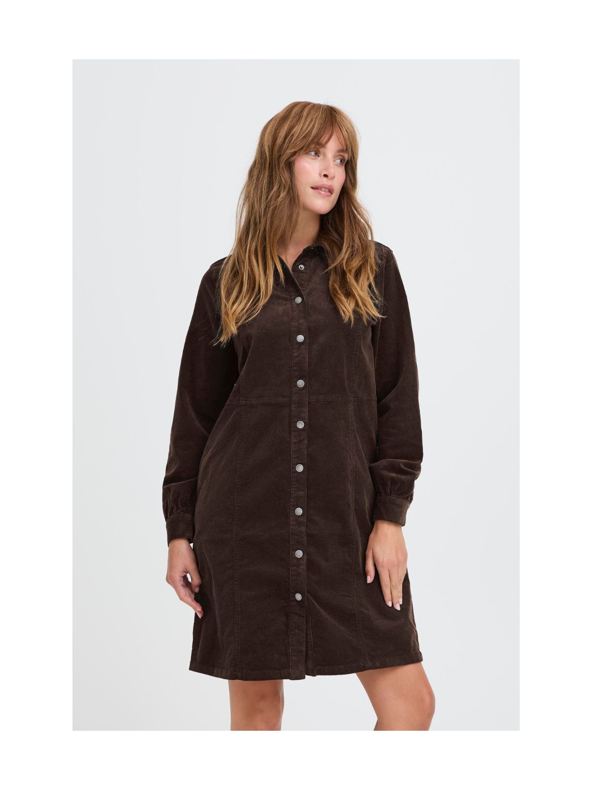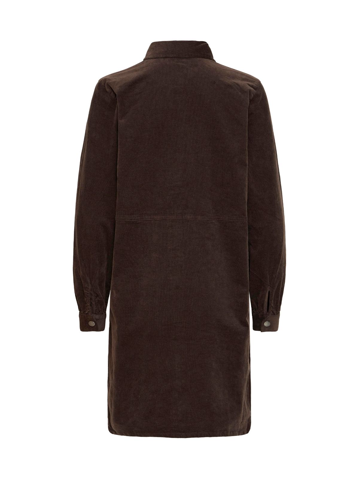 Smart fløjlskjole fra Pulz Jeans. Kjolen er knælang, har knaplukning langs fronten og lommer i siderne.Materiale: 83% Bomuld, 15% Viskose, 2% Elsatan