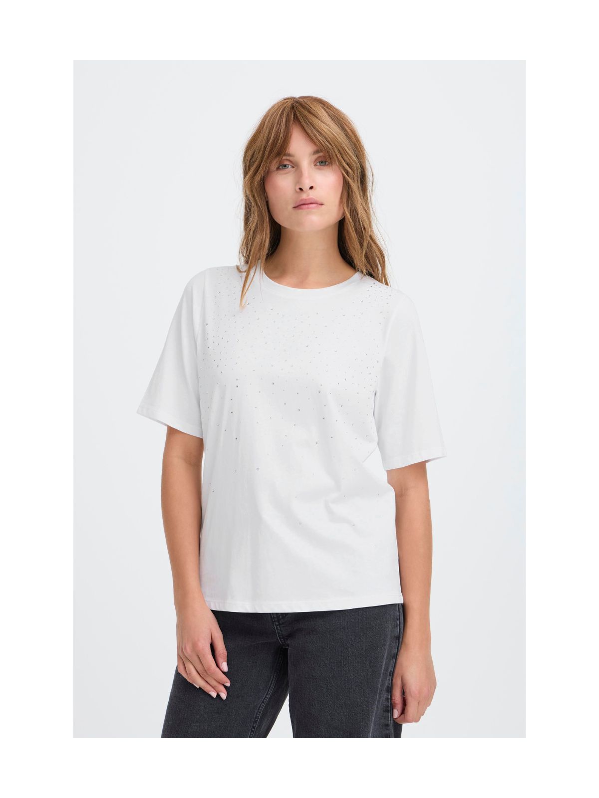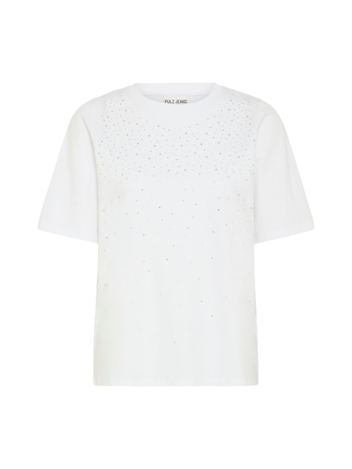Basic t-shirt fra Pulz Jeans. T-shirten har en rund halsudskæring, regulært fit og fine dekorative sten på øverste del. Style den til et par jeans eller nederdel for et feminint look.Materiale: 100% Bomuld