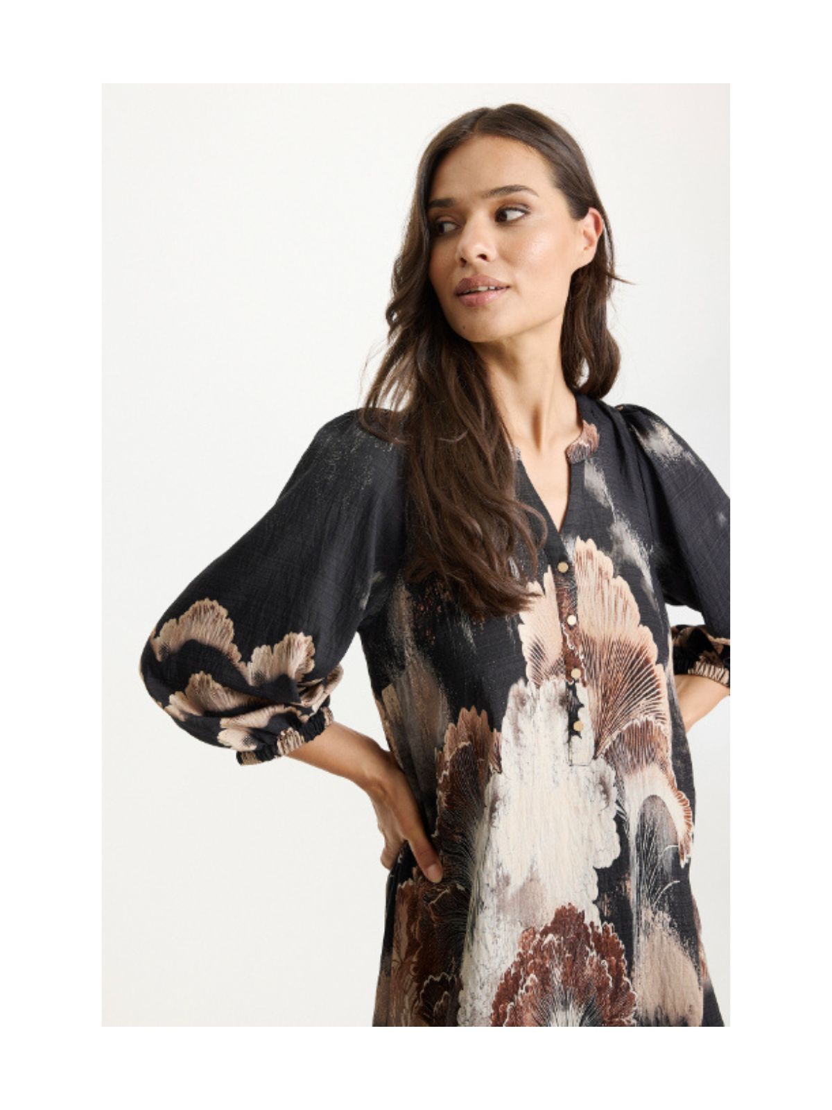 Kjole med mønster fra In Front. Kjolen har 3/4 lange ærmer med elastik i enden, afslappet fit og V-udskæring der ender ud med knaplukning.Pleje: Skånevask 30*C