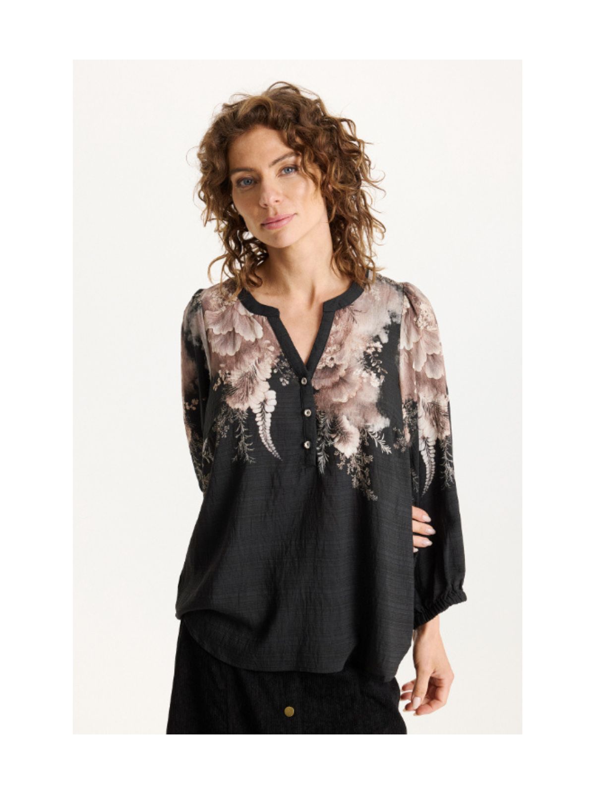 Smuk bluse fra In Front. Blusen har en V-udskæring der ender i en knaplukning, lange ærmer med elastik i enden, et afslappet fit og smukt blomstret mønster på øverste del af blusen.Pleje: Skånevask 30'C