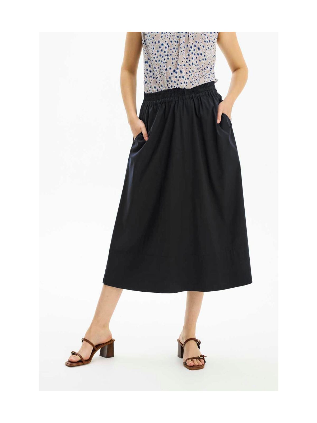 En elegant halvlang nederdel i klassisk A-facon, fremstillet i en glat og let kvalitet, der falder smukt. Nederdelen har en bred elastik i taljen, som sikrer en behagelig pasform, samt praktiske sidelommer, der giver et afslappet touch. Et tidløst design, der nemt kan styles med alt fra skjorter og bluser til T-shirts og jakker – perfekt til både hverdagsbrug og mere sofistikerede looks.Materiale: 65% Bomuld, 32% Polyester, 3% Elastan