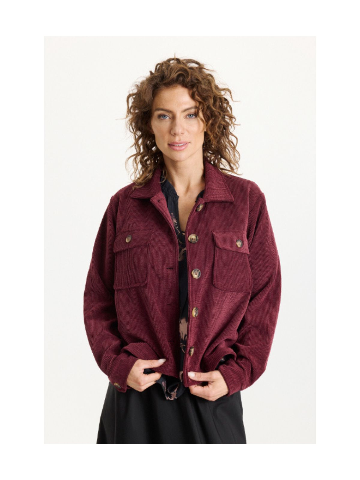 En stilfuld jakke i blød fløjl med en moderne, afslappet pasform. Jakken har klassiske brystlommer med knaplukning, store dekorative knapper foran og en flatterende længde, der gør den nem at style til både kjoler og bukser. Den dybe bordeaux nuance giver et varmt og sofistikeret udtryk, perfekt til efterår og vinter. Brug den som et cool alternativ til en cardigan eller som et let overtøj på overgangsdage.Farve: Burgundy