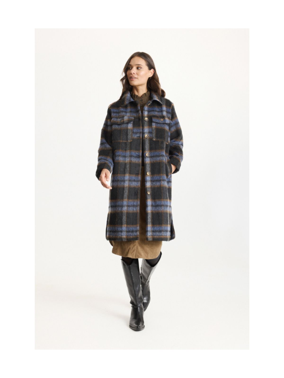 En moderne og alsidig jakke i et tidløst ternet mønster. Jakken har en løs, komfortabel pasform og er designet i en blød uldblanding, der holder dig varm på kølige dage. Den klassiske skjortekrave, knaplukning og praktiske brystlommer tilfører et afslappet, men stilrent udtryk. Perfekt til lag-på-lag styling – brug den over en kjole med høje støvler for et feminint look eller kombiner den med jeans og sneakers for en mere casual hverdagsstil.Farve: Brun