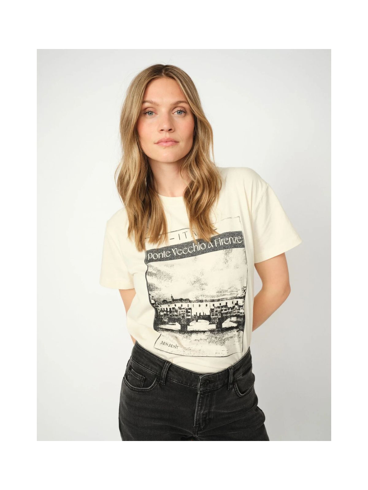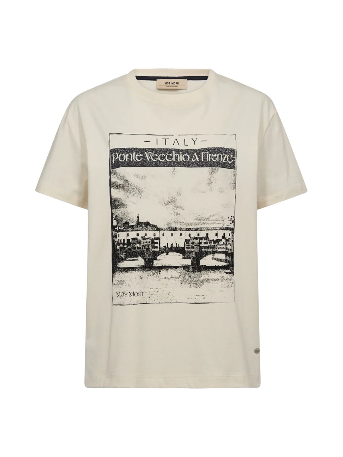 Denne tidløse t-shirt har klassisk O-hals og korte ærmer for en komfortabel pasform. Det markante frontprint giver en moderne kant og gør den til et statement-piece i garderoben. Style den med jeans for et afslappet look eller under en blazer for en cool vibe.Materiale: 100% Økologisk bomuld