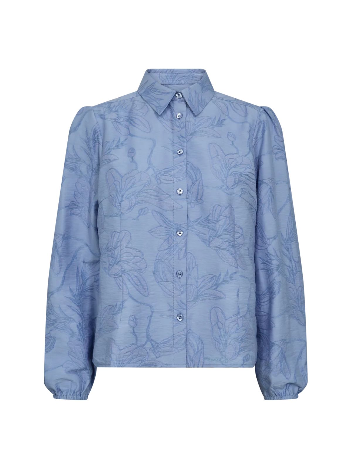 Denne elegante skjorte kombinerer tidløs polering med feminine detaljer. Den har klassisk krave, knaplukning, plisserede skuldre og elastiske manchetter, mens det florale jacquardstof tilfører en raffineret tekstur. Perfekt til både skræddersyede bukser og denim for et ubesværet sofistikeret look.Materiale: 57% Lenzing Ecovero viskose, 26% Polyester, 17% Polyamid