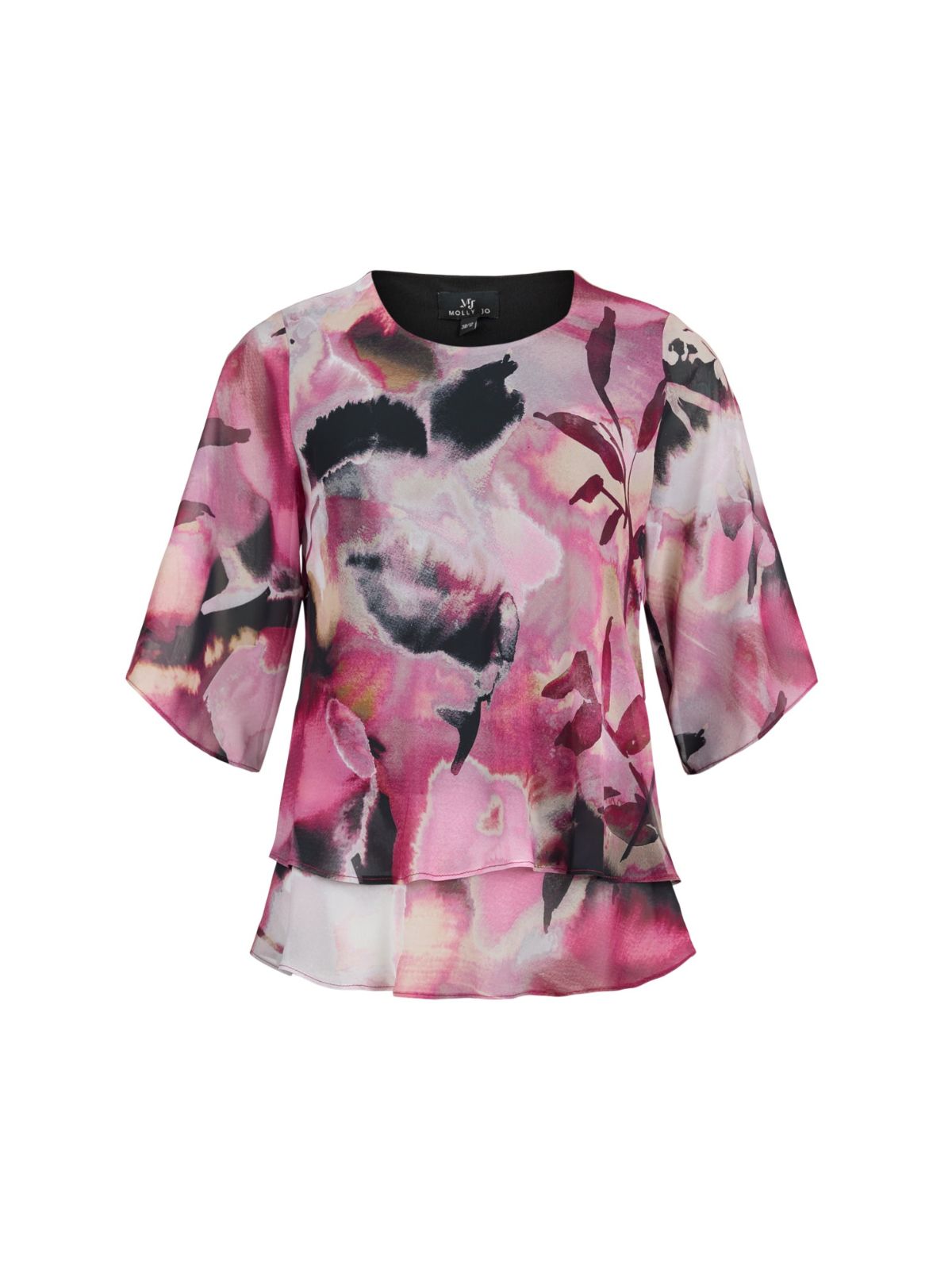 Feminin flora blise fra MOLLY JO i smuk farve kombination. Blusen er let taljeret med rund hals, lag på lag effekt samt 3/4 lange ærmer. Flot bluse til både buks eller nederdel.Længde: ca. 66 cm