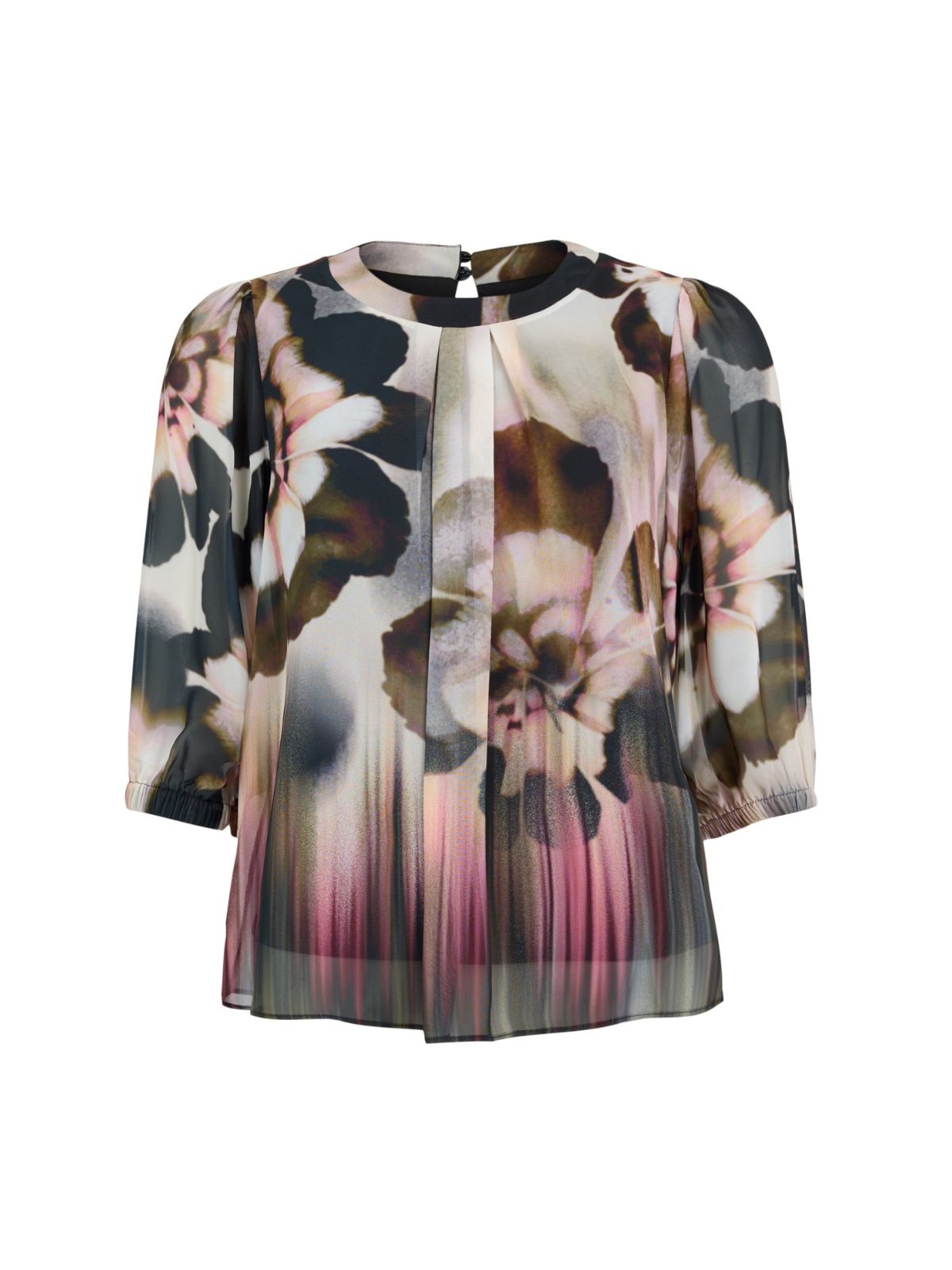 Elegant bluse fra MOLLY JO med flora print. Blusen har en rund hals med knaplukning i nakken samt albuelange ballonærmer.Længde: ca, 66 cm