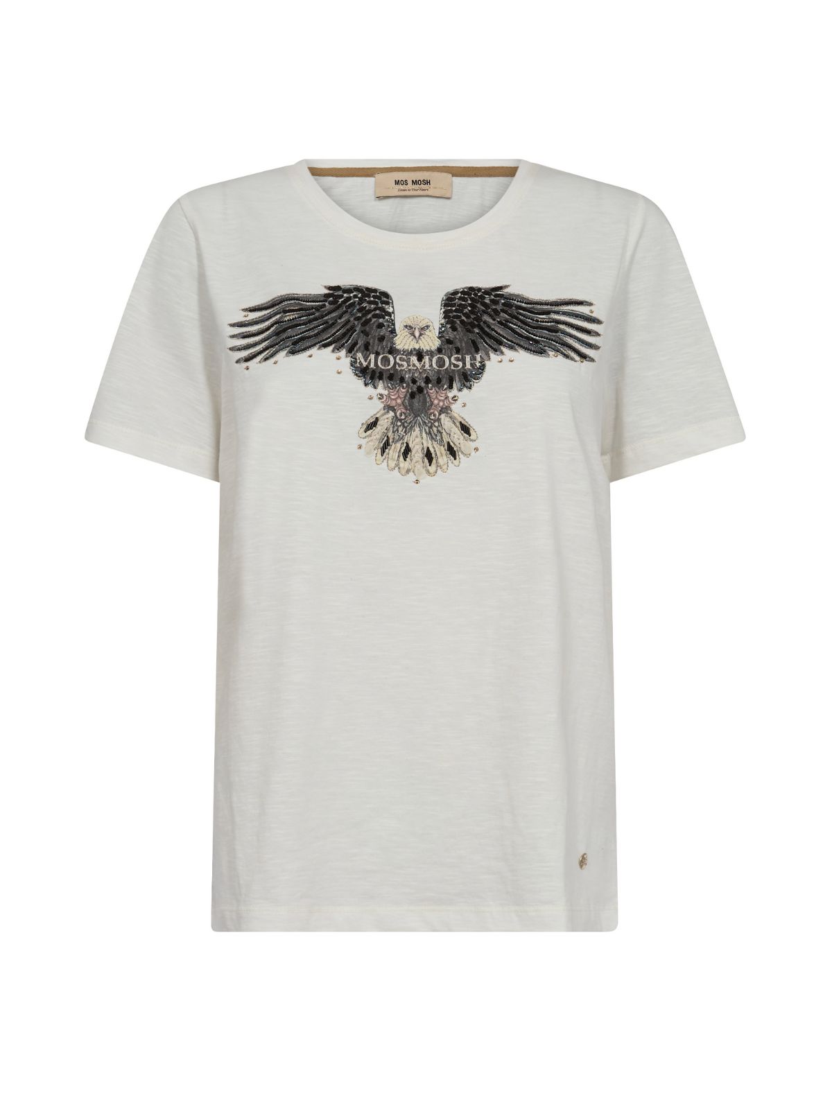 Denne stilfulde T-shirt har regular fit, klassisk O-hals og korte ærmer for daglig komfort. Det markante ørneprint foran er pyntet med glitrende palietter, der giver et edgy og sofistikeret touch. Perfekt til både afslappede outfits og som statement-piece, kan styles med jeans eller under en blazer.Materiale: 100% Bomuld