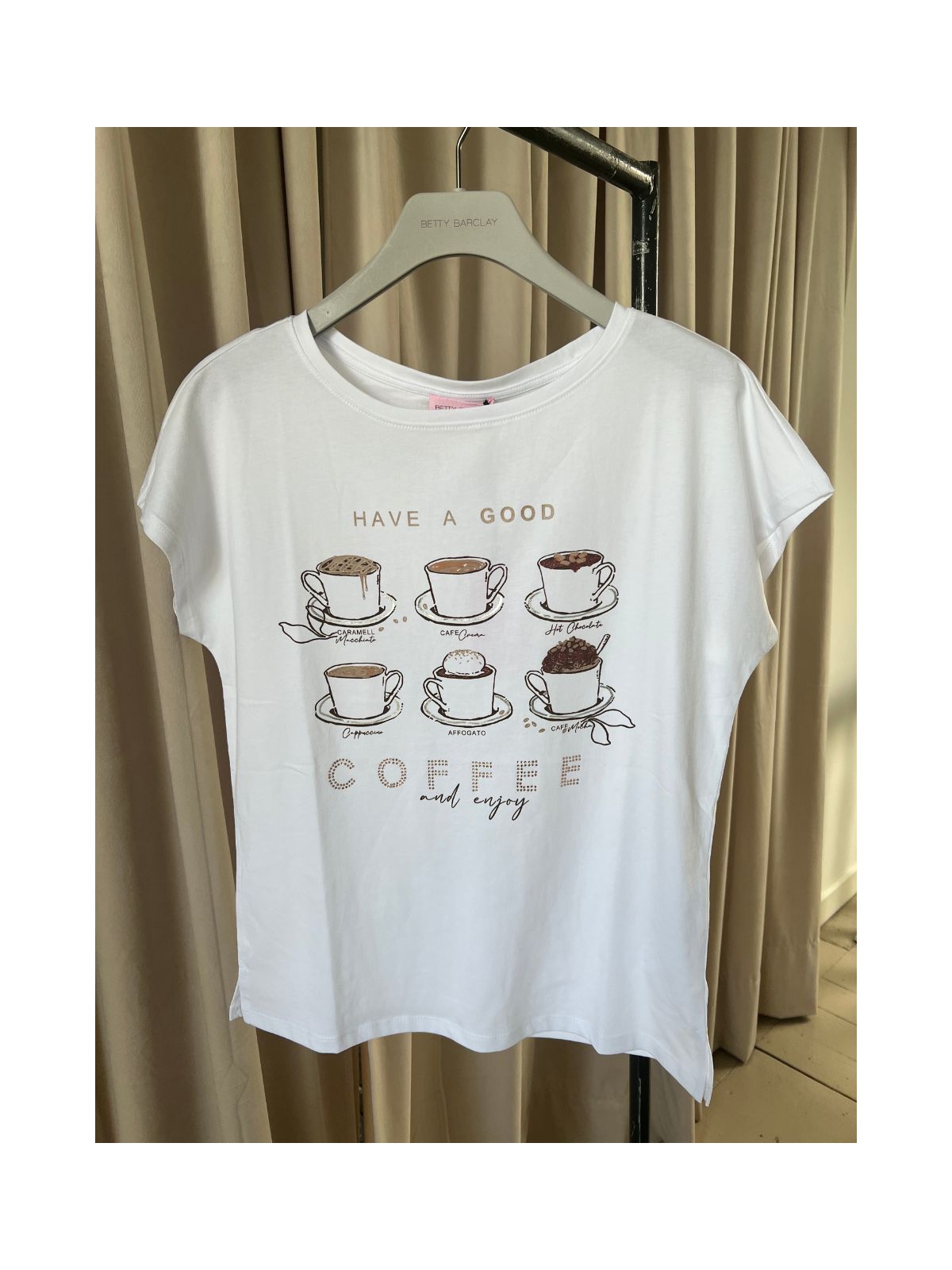 Smart t-shirt fra Betty Barclay. T-shirten har kaffekop print samt dekorative sten og et afslappet fit med små slids i siden.Materiale: 100% Bomuld