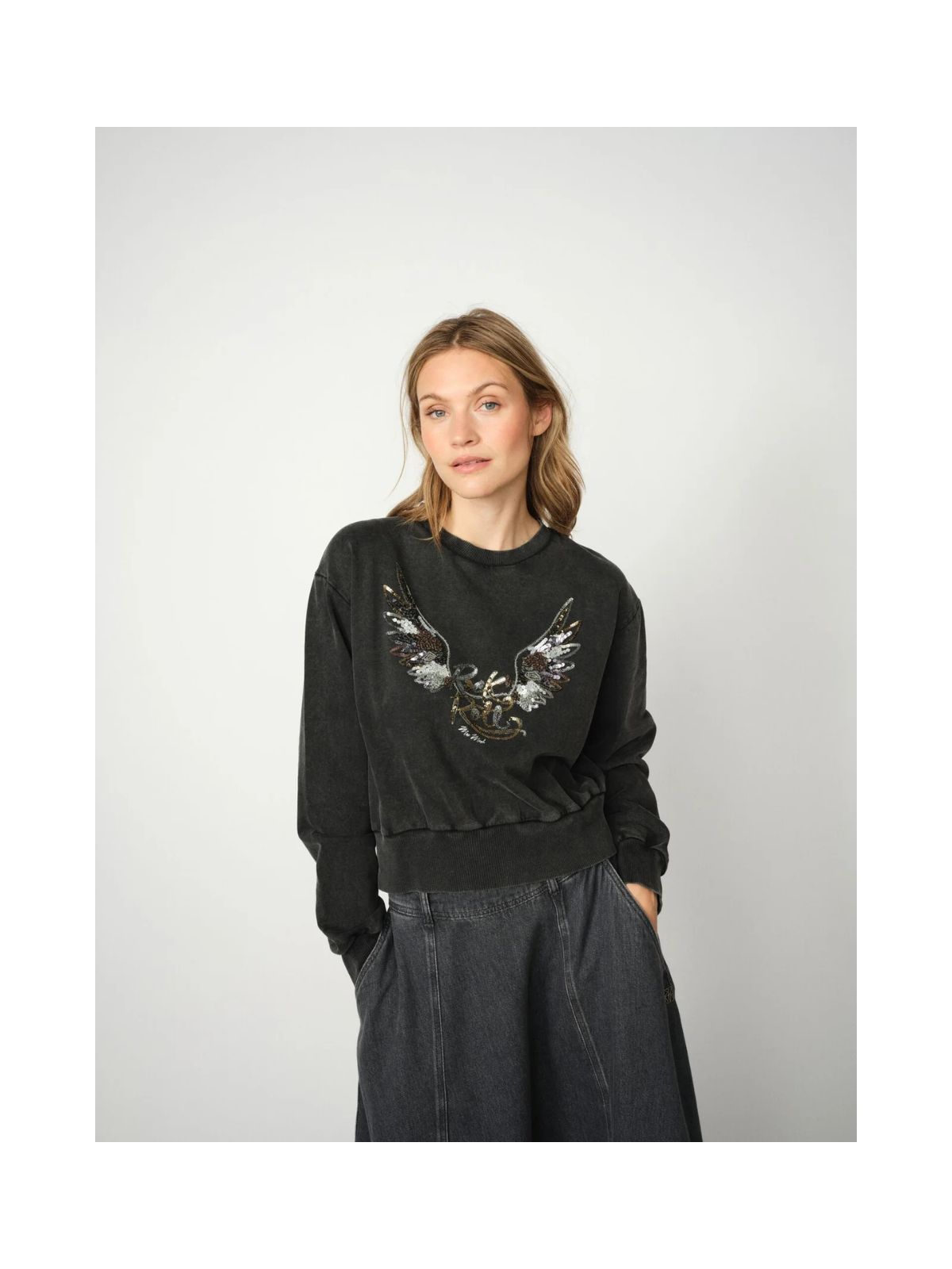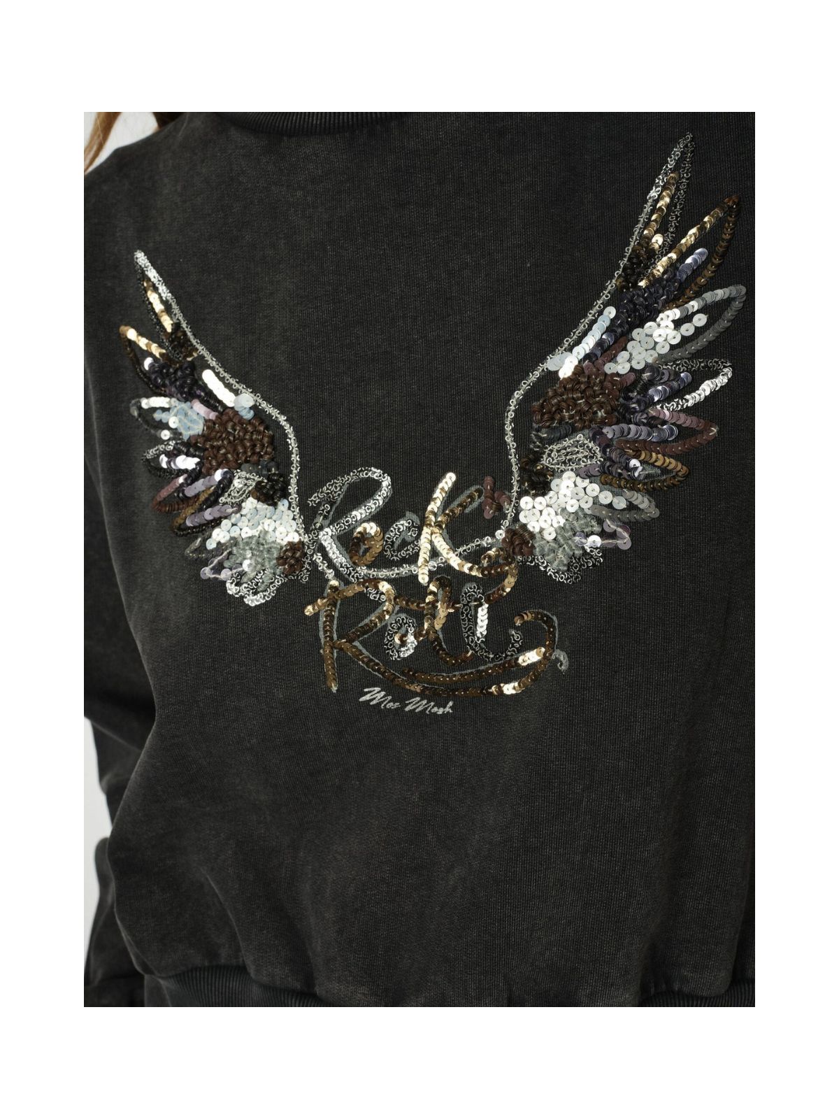 Giv dit outfit kant med denne sweatshirt i løs pasform, der kombinerer afslappet komfort med stil. Ribdetaljer ved hals, ærmer og sømme sikrer struktur, mens det rock’n’roll-inspirerede frontprint med glitrende palietter tilfører energi. Perfekt til jeans eller læderbukser for et rebelsk og moderne look.Materiale: 99% Økologisk bomuld, 1% Elastan