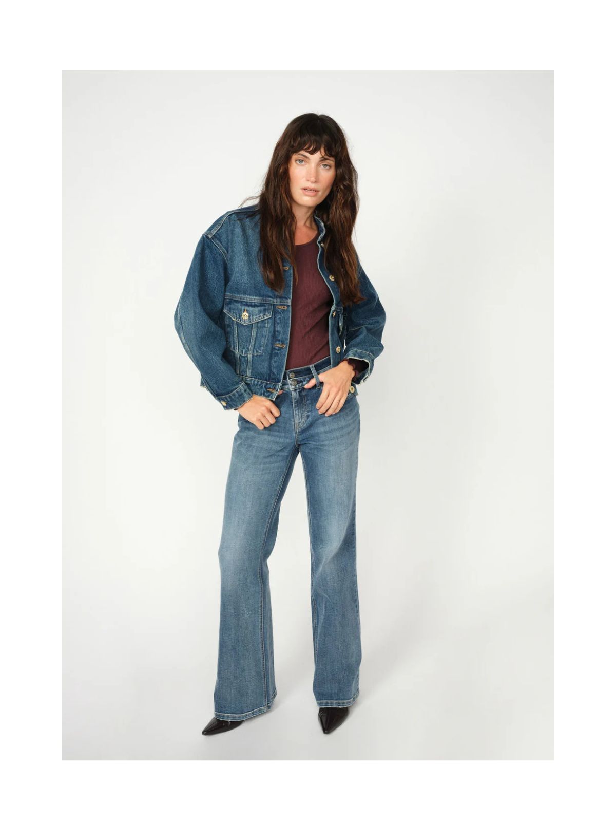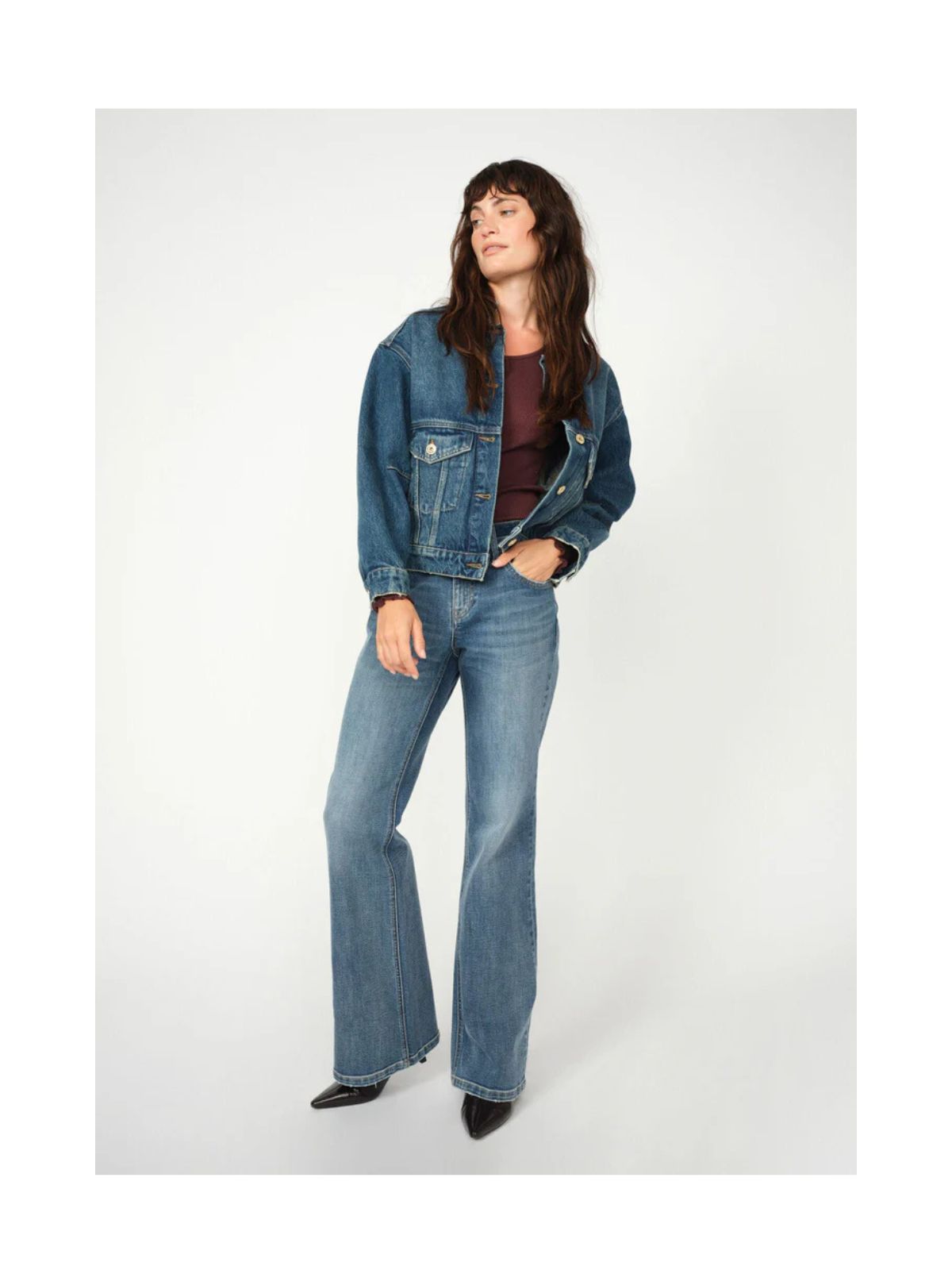 Trendy jeans i en flatterende flare-pasform med mid-rise, der forener elegance og komfort. Forlommerne har stilfulde detaljer, mens en lynlåslomme i siden giver et moderne twist. Perfekte at style med en sofistikeret bluse eller en statement-T-shirt for et chikt hverdagslook.Materiale: 85% Bomuld, 14% Polyester, 1% Elastan