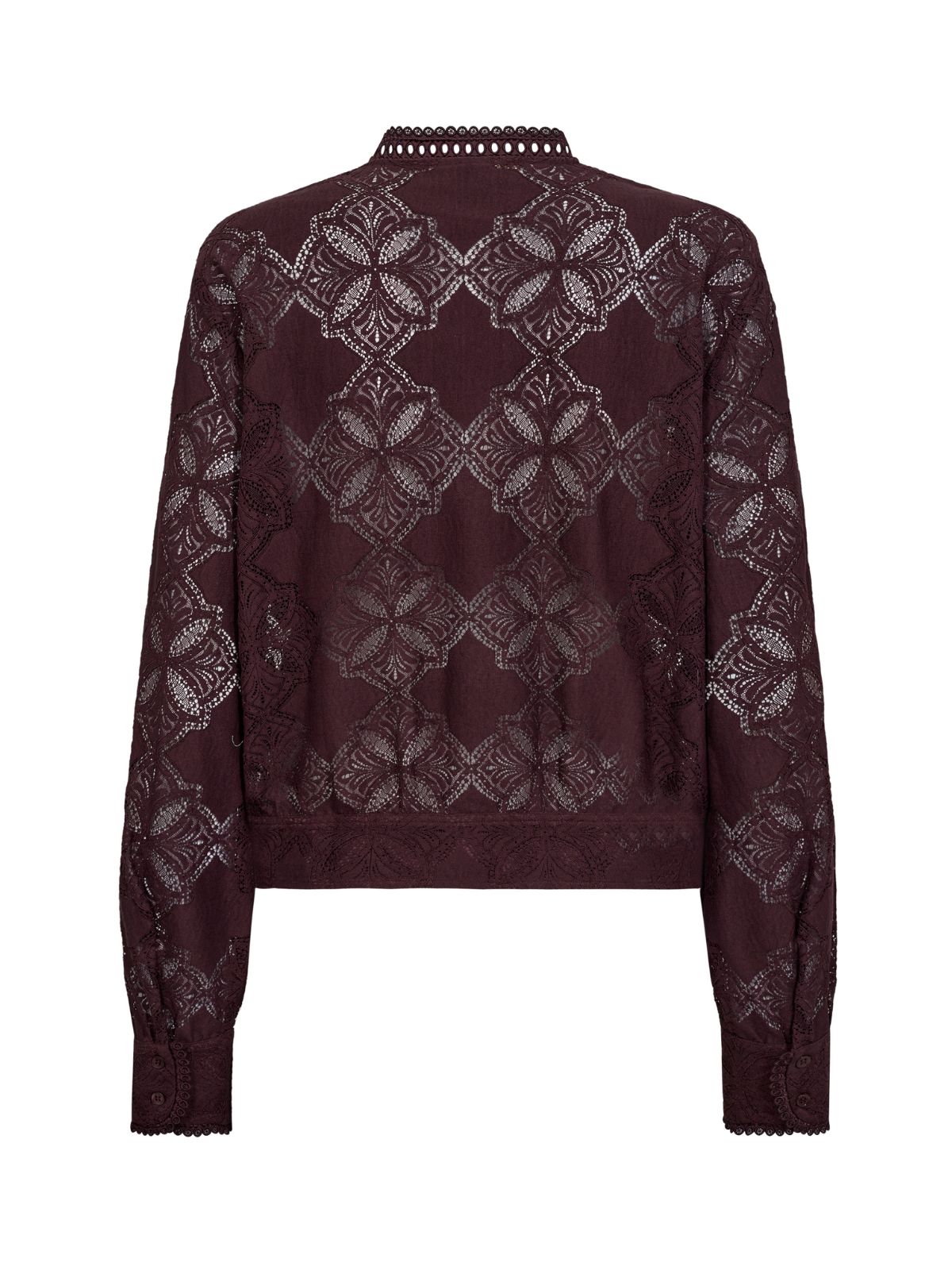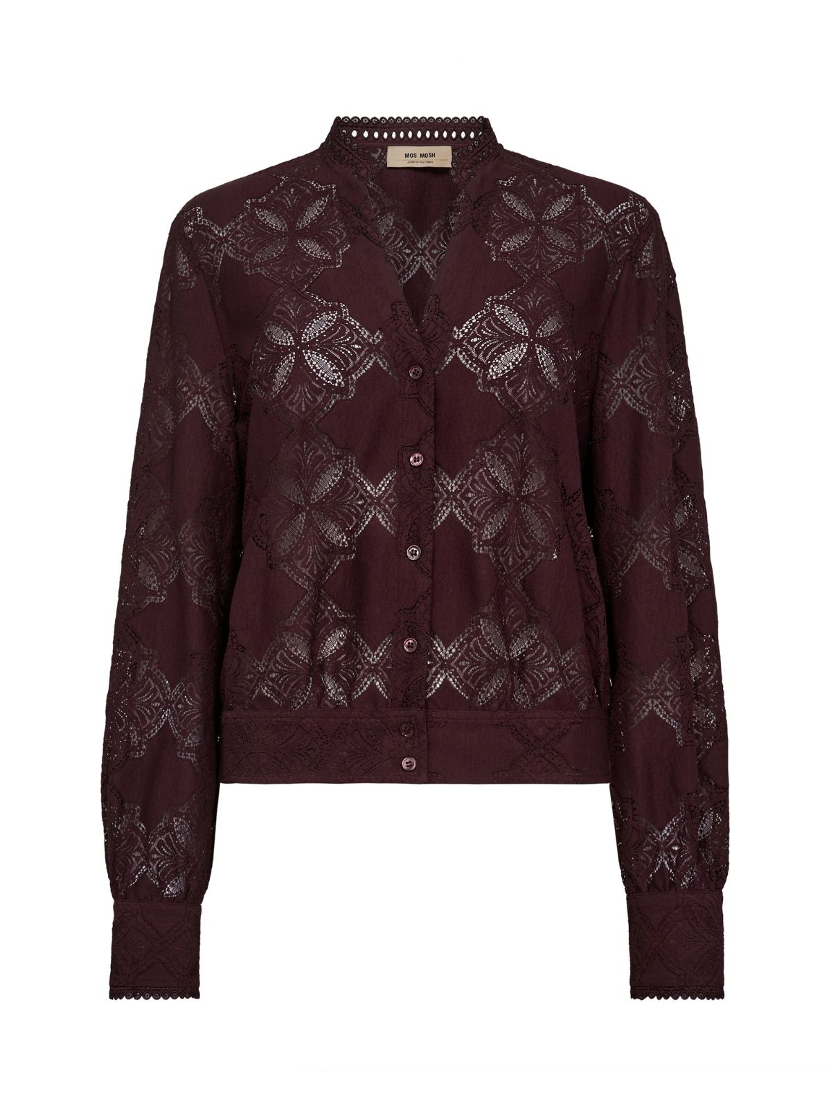Elegant blondeskjorte fra Mos Mosh med lange ærmer, brede manchetter og kinakrave i halsen. Skjorten har små knapper langs fronten og er lavet i den smukkeste blondekvalitet, der tilføjer et feminint og raffineret udtryk.Materiale: 60% Bomuld, 40% Polyamid / 100% Viskose