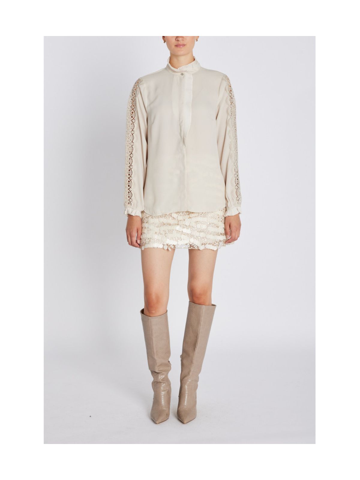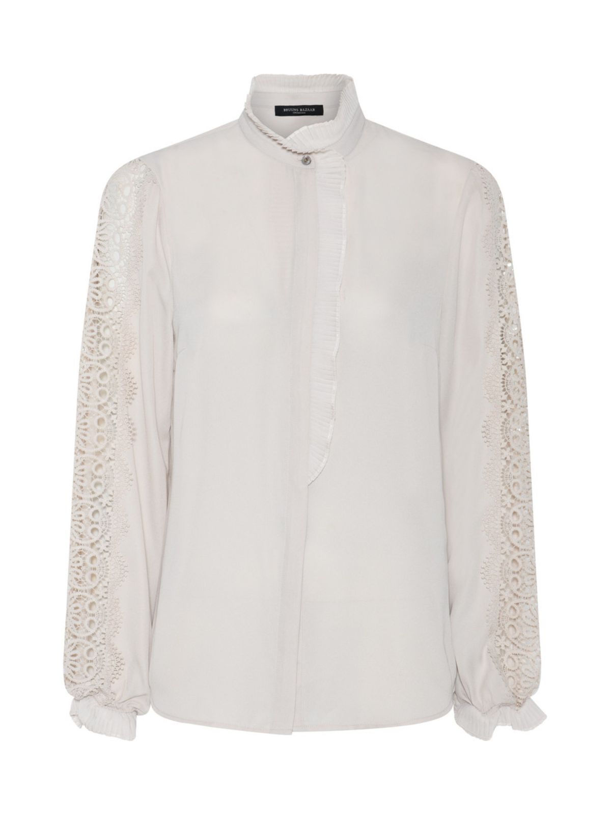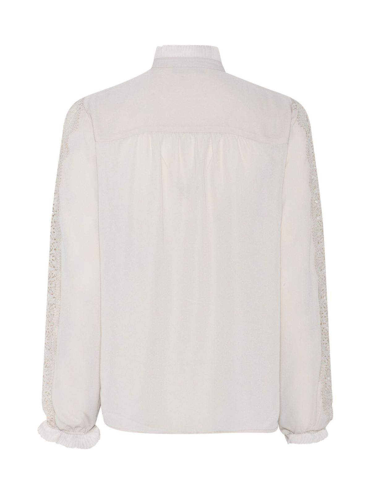 Elegant skjorte med straight fit, fine blonde-detaljer langs ærmerne og plisseret kant ved hals og lukning. Skjorten lukkes med skjulte knapper og kan styles med klassiske bukser og hæle til kontoret eller med denim og støvler til et feminint hverdagslook. Perfekt til både arbejdsdage og middage i byen.Materiale: 100% Genanvendt polyester