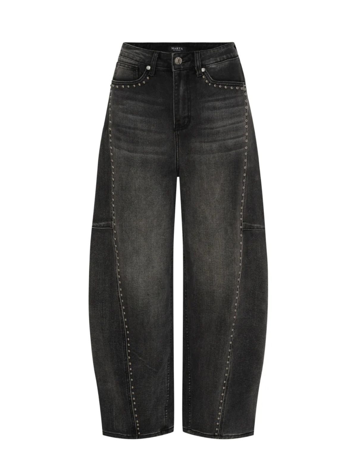 Cool baggy jeans fra Marta du Château med nitte-detaljer. Bukserne har knap- og lynlåslukning samt lommer foran og bag, hvilket gør dem både praktiske og stilfulde. Perfekte til ethvert outfit, uanset om de styles med en top og blazer, en strik eller skjorte.Farve: DENIM - MØRK GRÅ