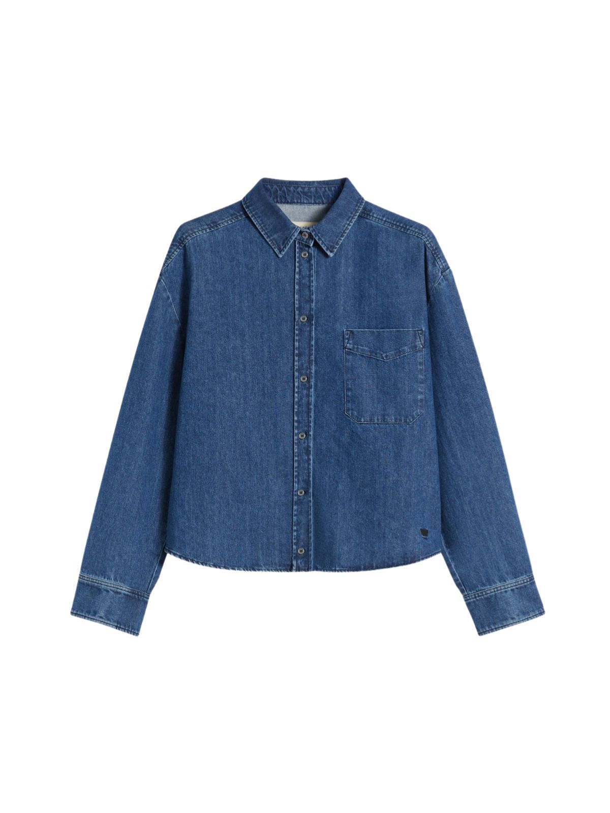 Crop-skjorte med brystlomme og blød silhuet. Fremstillet i vasket silke med klassisk skjortekrave, lange isyede ærmer og synlig knaplukning foran. Let udsving forneden, bærestykke og midterlæg på ryggen samt afrundet sømkant.Materiale: Vasket silke