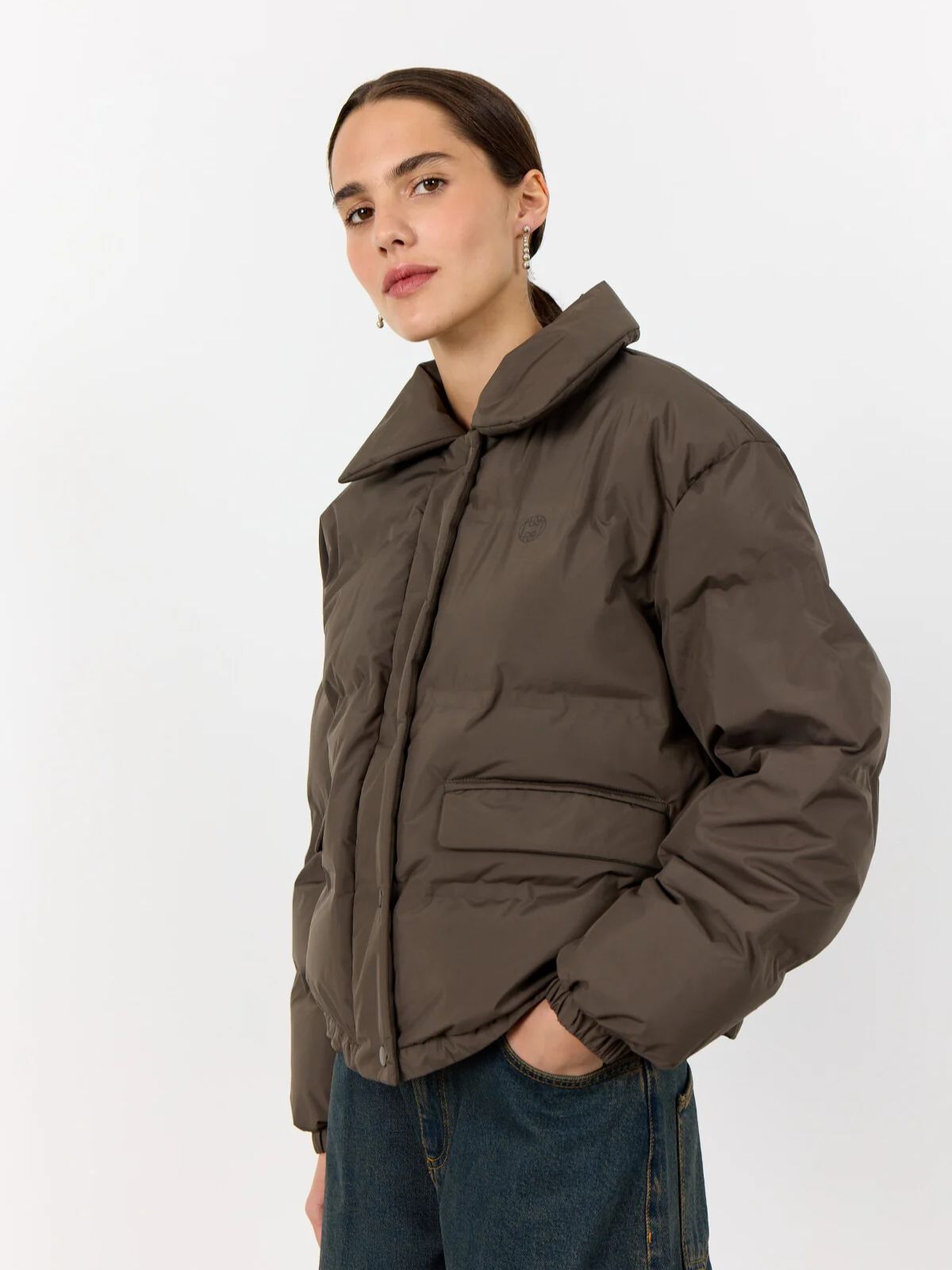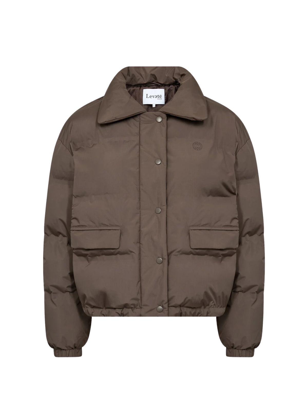 Sporty puffer jakke MONA fra LEVETÈ ROOM i smart design. Jakken har en høj, bred krave, knaplukning foran, quiltet design med rummelige lommer og justerbare snore forneden. Sæt den sammen med jeans eller skræddersyede bukser for et afslappet eller raffineret look.Længde: ca. 60 cm målt i str. M