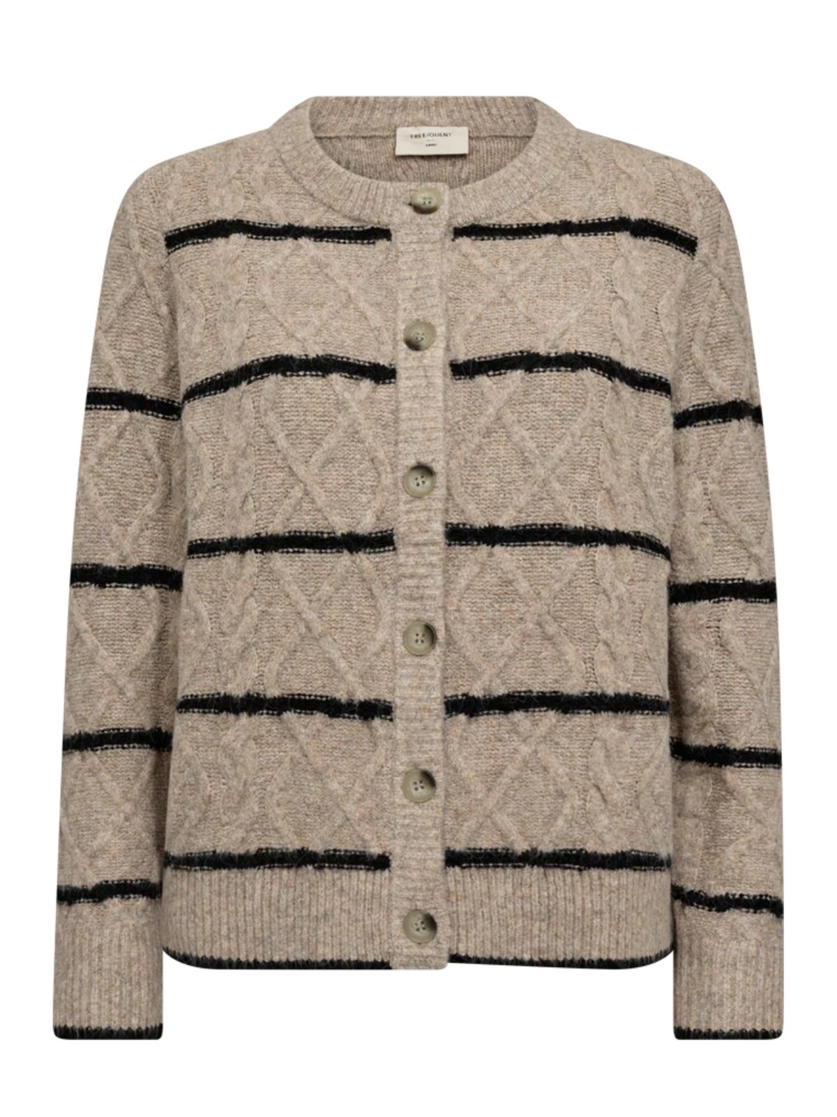 Charmant cardigan fra Freequent i cabel strikket kvalitet. Cardiganen er enkel i modellen med lange ærmer, brede ribkanter, knaplukning på fronten samt smukt kabelstrikket mønster som udstråler et casual udtryk.Længde: ca. 60 cm