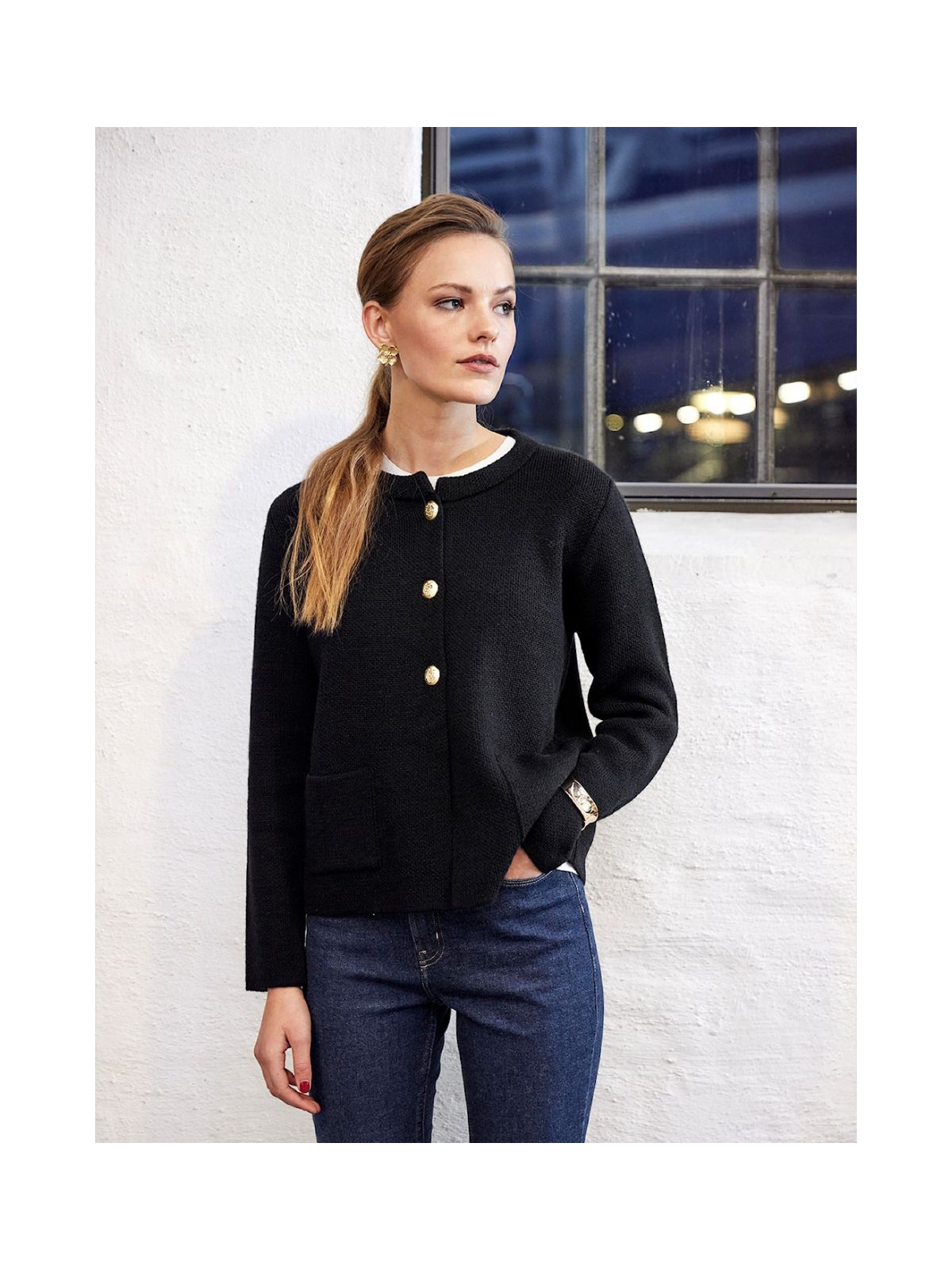 Denne strikcardigan kombinerer tidløs elegance med komfort og høj kvalitet, fremstillet i Italien. Klassisk design med guldfarvede knapper og praktiske lommer giver et sofistikeret touch. Perfekt til både hverdag og festlige lejligheder, og nem at style til ethvert outfit.Materiale: 45% Akryl, 40% Uld, 10% Viskose, 5% Alpaka