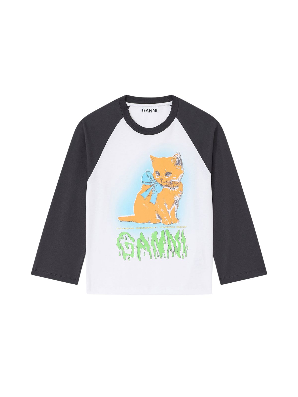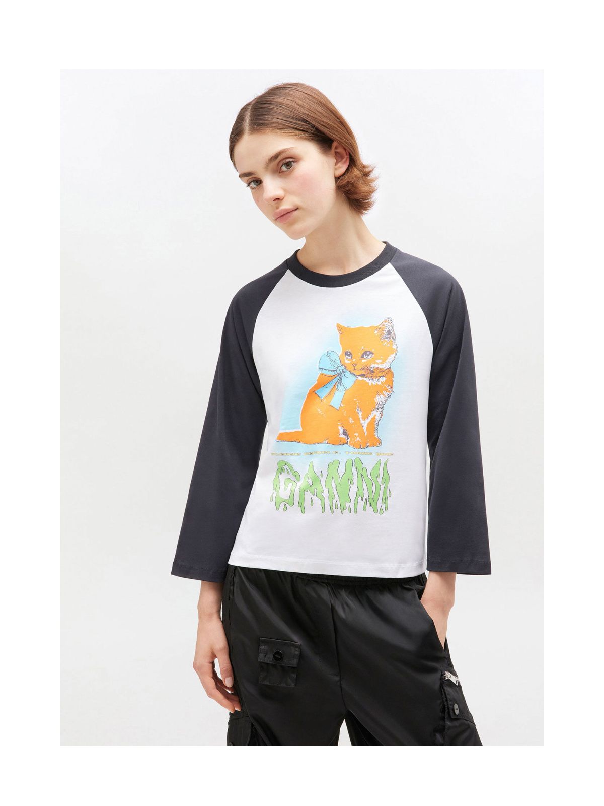 Denne T-shirt er fremstillet i blød økologisk bomuld og kombinerer komfort med et legende grafisk katteprint. Den har rund hals, trekvartærmer med kontrastkant og et tydeligt GANNI-logo. Perfekt til en afslappet hverdag med et strejf af humor og stil.