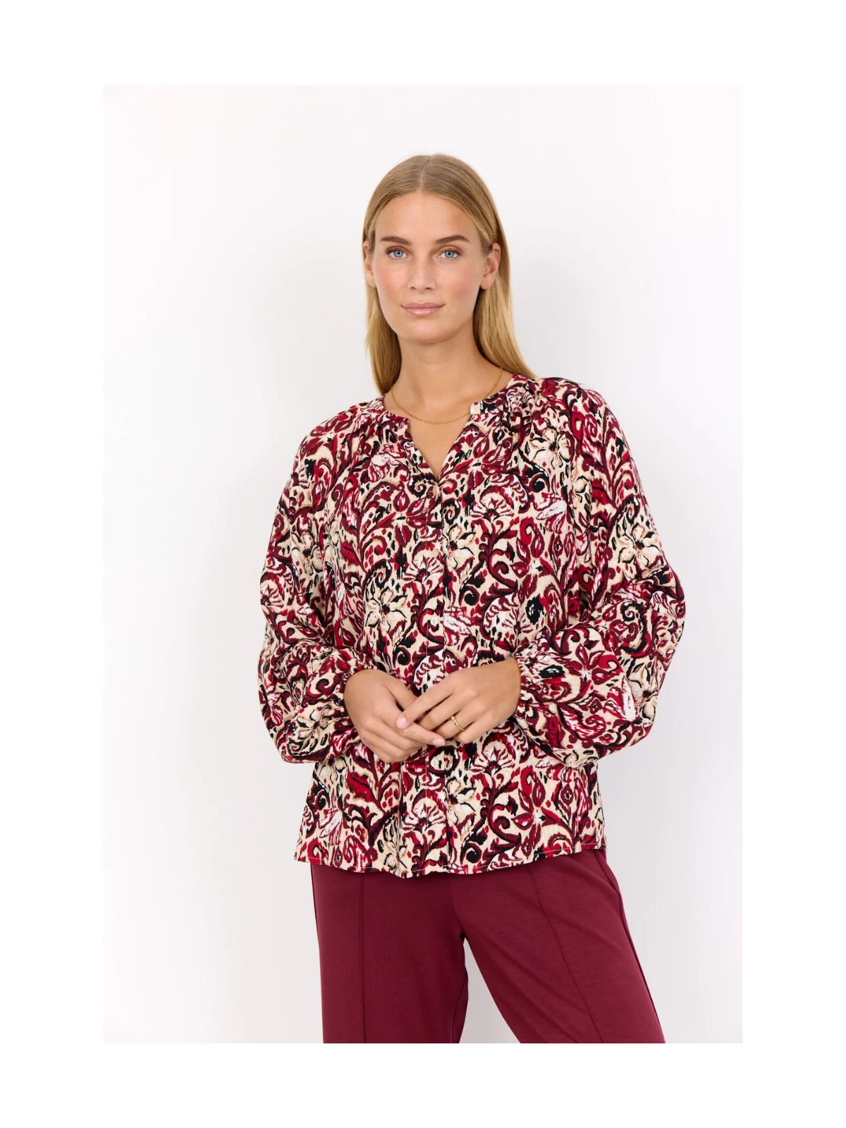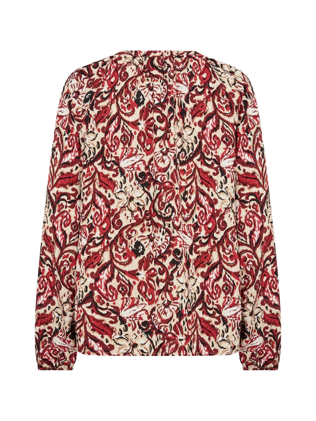 Smuk bluse fra Soya. Blusen har en V-udskæring, lange ærmer samt et iøjnefaldende, indviklet print. Style den med skræddersyede bukser eller denim for et elegant og moderne look.Materiale: 100% Lenzing Ecovero Viskose
