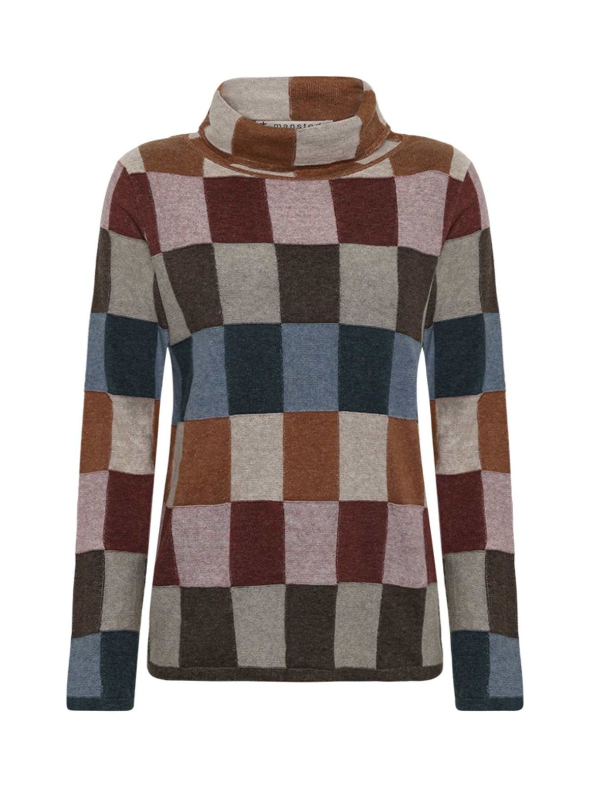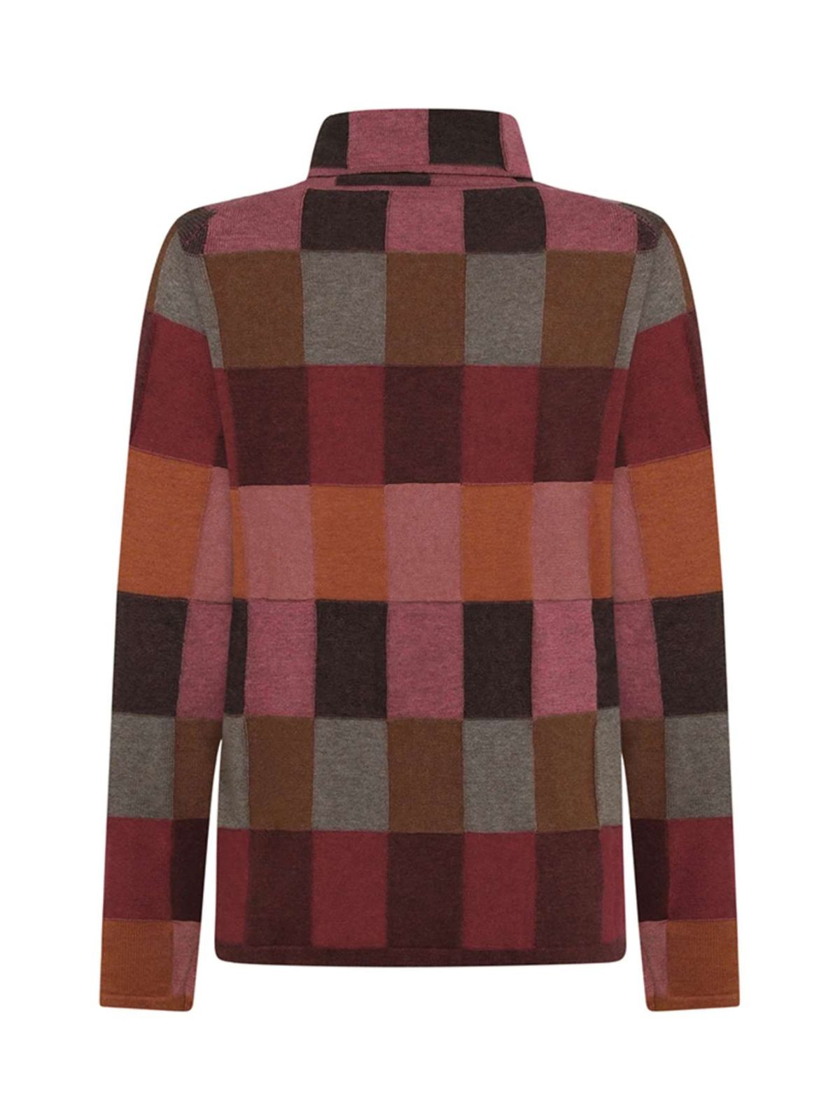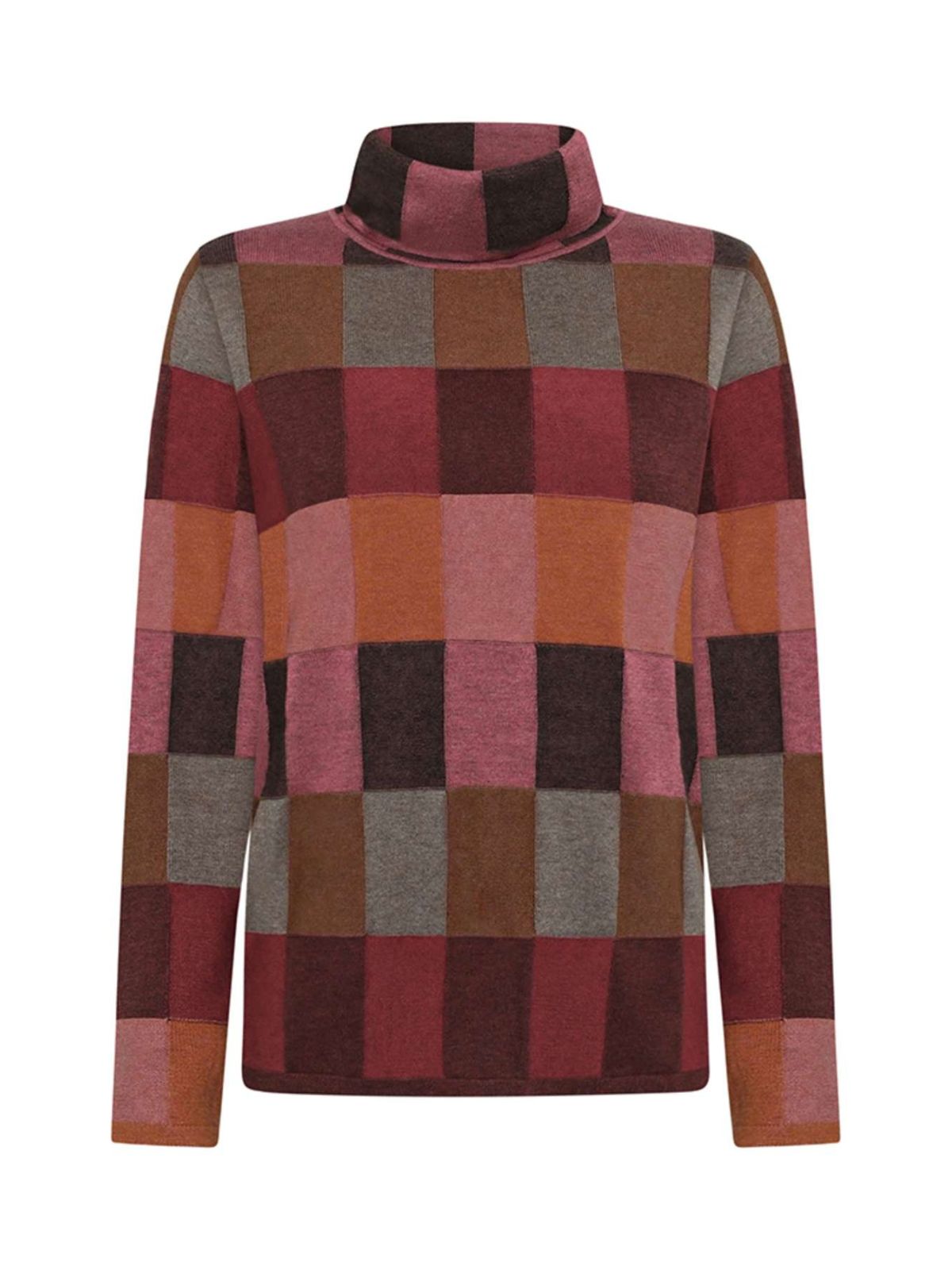 En striktrøje med et vævet ternet mønster i glatstrik og omvendt struktur. Rullekraven har en høj hals, der kan foldes på forskellige måder.Materiale: 100% Økologisk bomuld