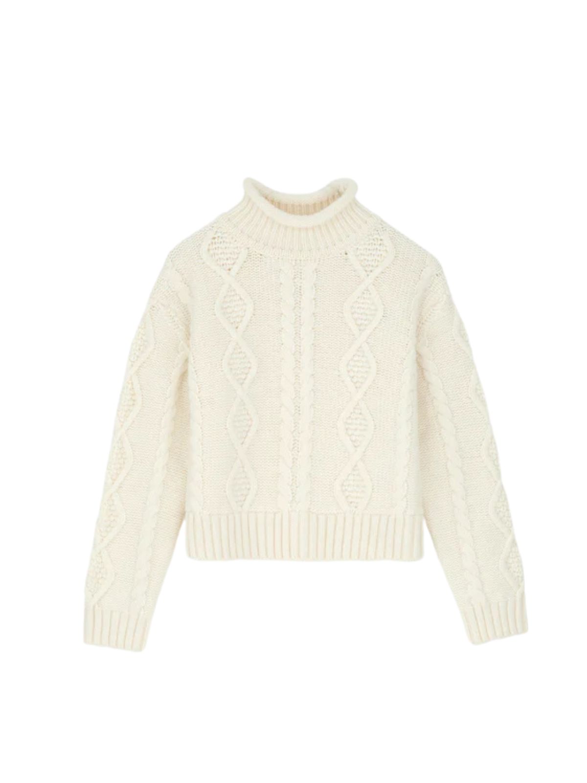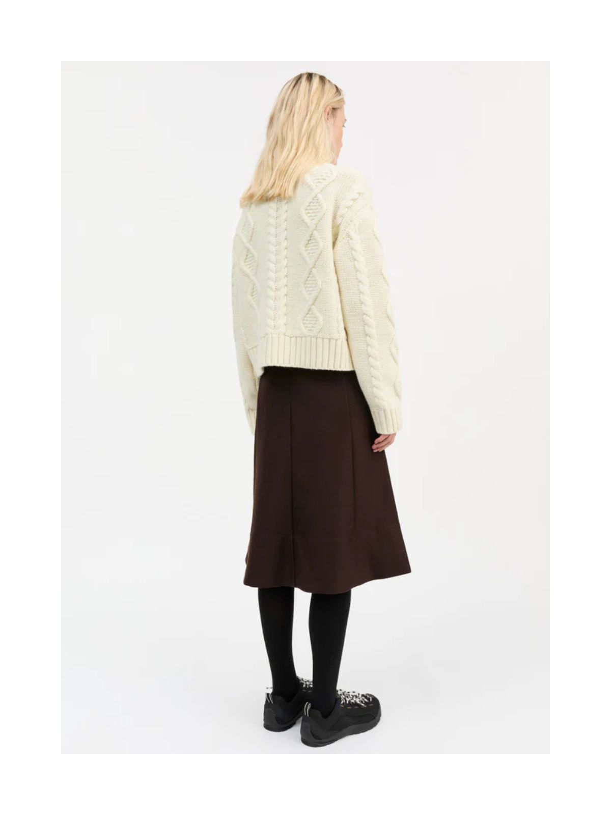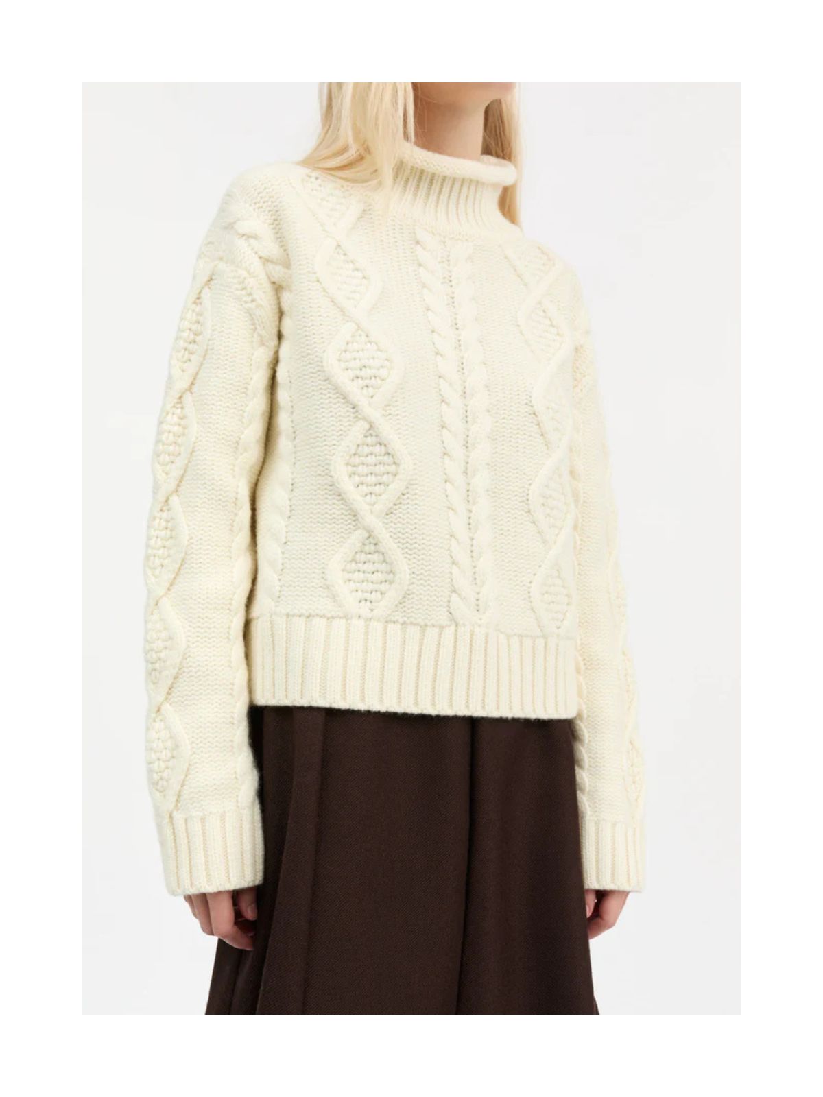 Sporty White Sun O-neck Jumper fra SKALL er en oversized strik med dropped shoulders og et miks af kabelstrik, perlestrik og Aran-mønstre på krop og ærmer. Den har en høj ribhals med rullet kant og kraftige ribafslutninger ved bund og ærmer.Længde: 60 cm