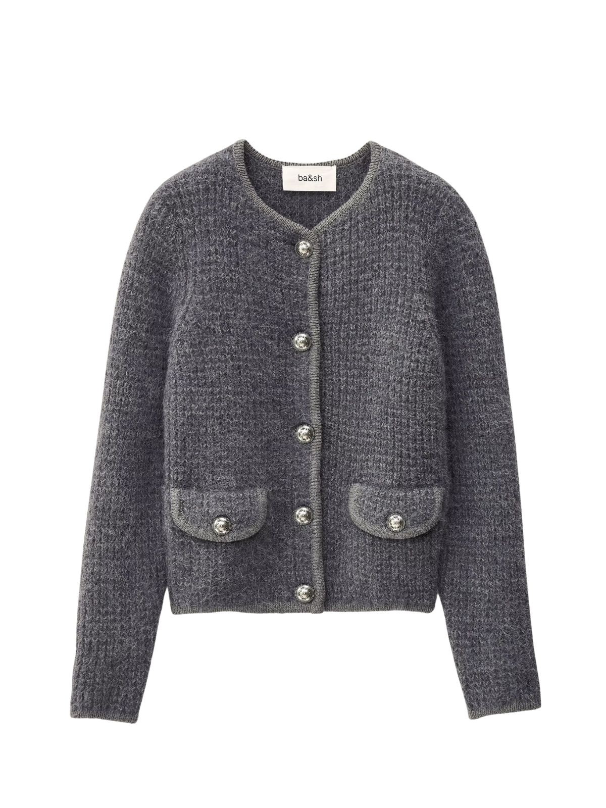 Elegant cardigan fra BA&SH i flot struktur strikket design. Cardiganen har rund hals samt knaplukning med markante knapper og lomme detaljer på fronten-Længde: ca. 58 cm