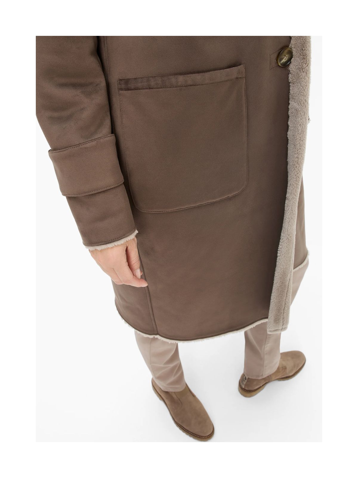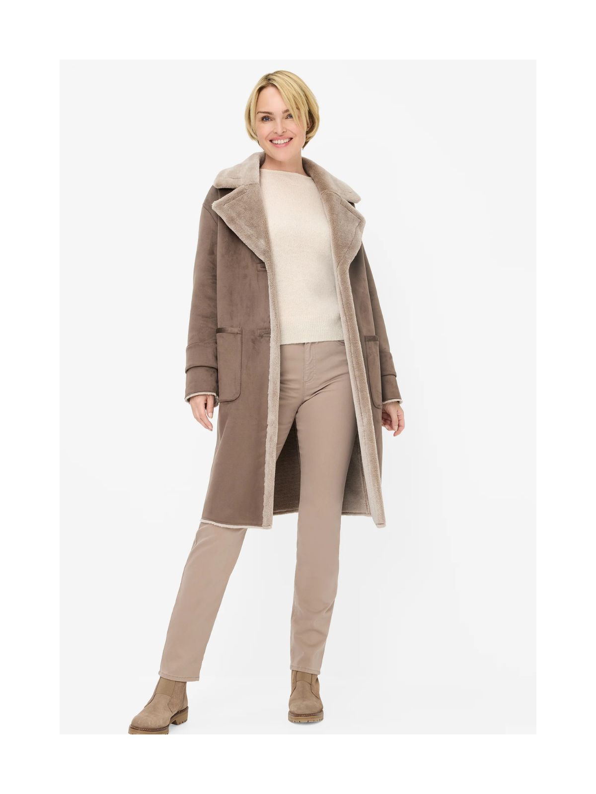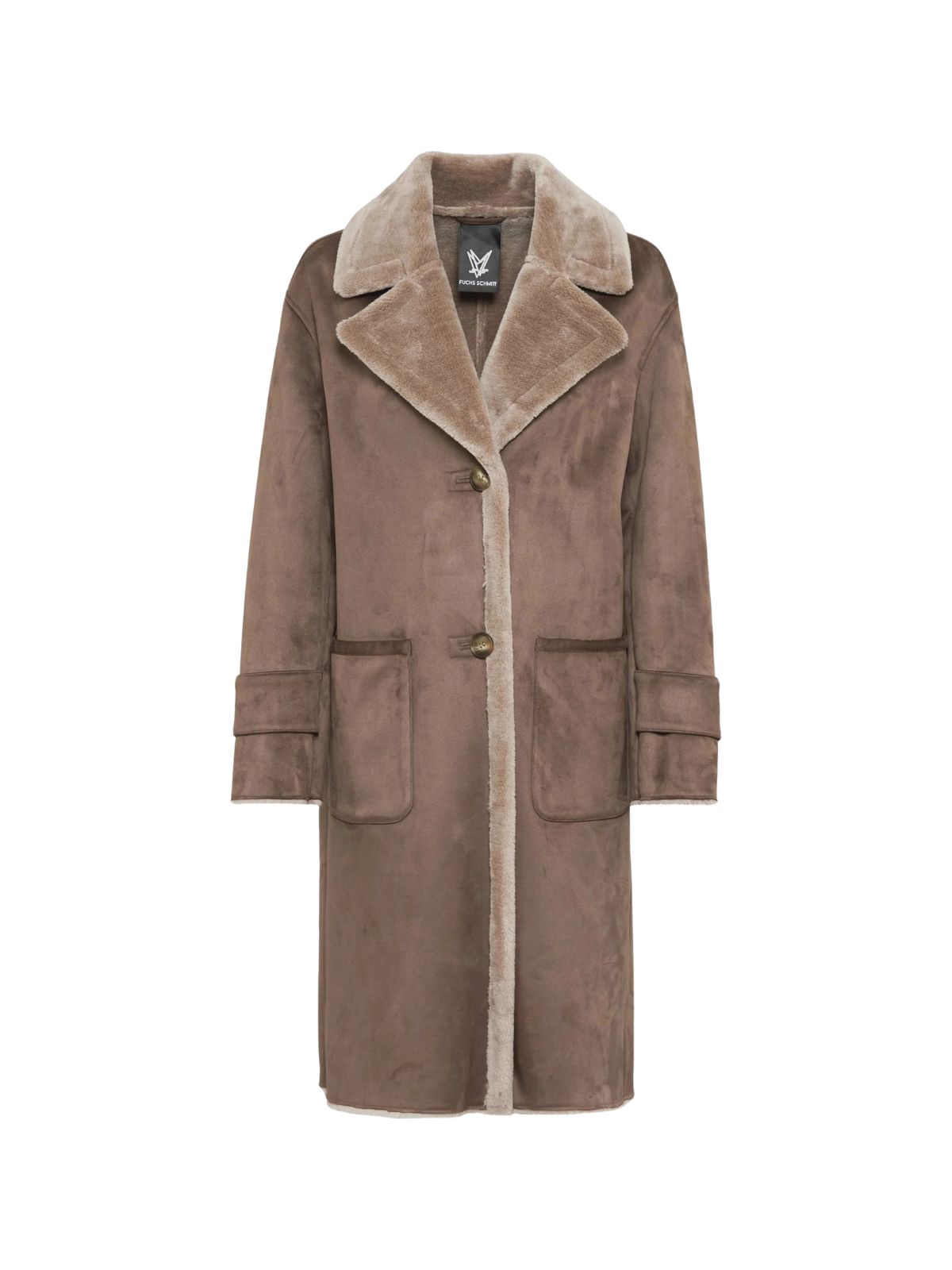 Raffineret frakke i imiteret rulams pels fra FUCHS SCHMITT med rene linjer og en blød fornemmelse og giver det klassiske efterårs-/vinterlook et moderne touch. Frakken har et lige snit og en afslappet silhuet, med krave og store, tonale knapper der tilføjer struktur til designet. Synligt teddyfor på kraven, kanten og manchetterne samt påsyede lommer og dekorative ærmestropper fuldender det overordnede look.Sæson: Efterår / vinter