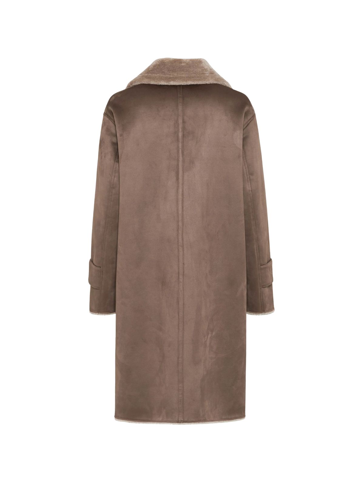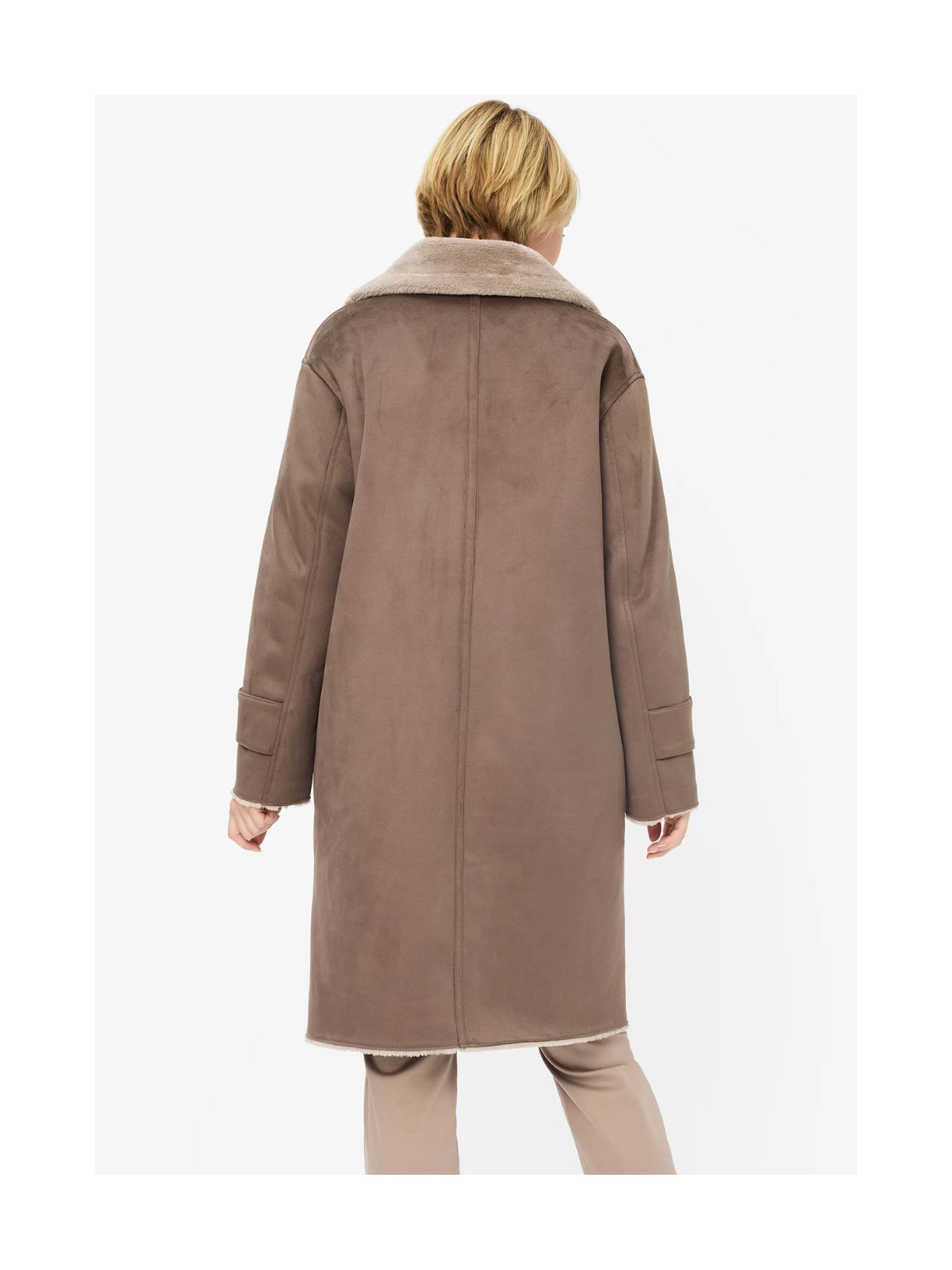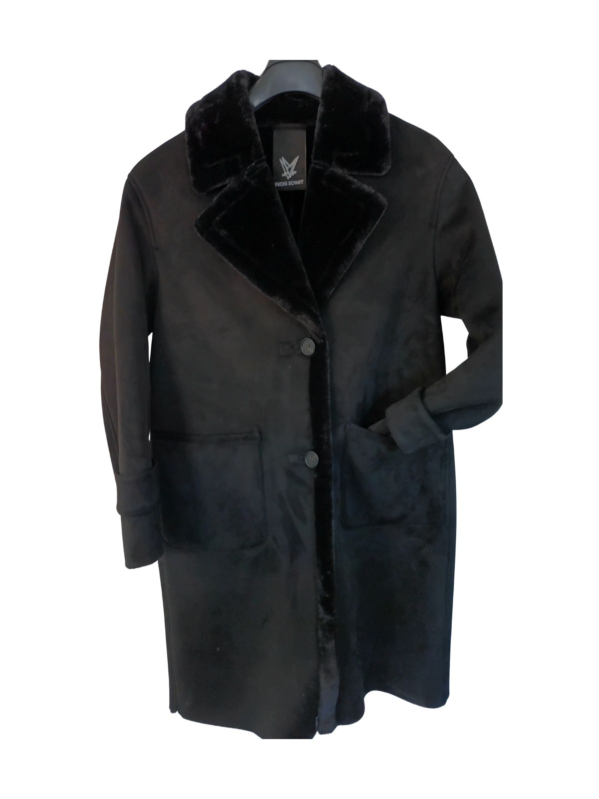 Raffineret frakke i imiteret rulams pels fra FUCHS SCHMITT med rene linjer og en blød fornemmelse og giver det klassiske efterårs-/vinterlook et moderne touch. Frakken har et lige snit og en afslappet silhuet, med krave og store, tonale knapper der tilføjer struktur til designet. Synligt teddyfor på kraven, kanten og manchetterne samt påsyede lommer og dekorative ærmestropper fuldender det overordnede look.Sæson: Efterår / vinter