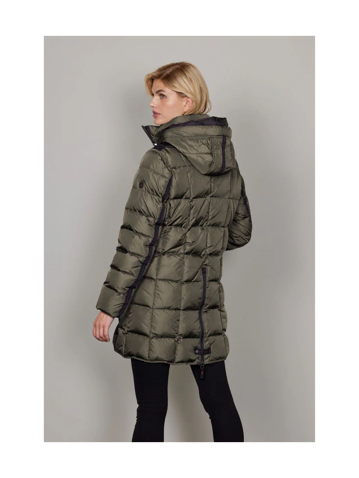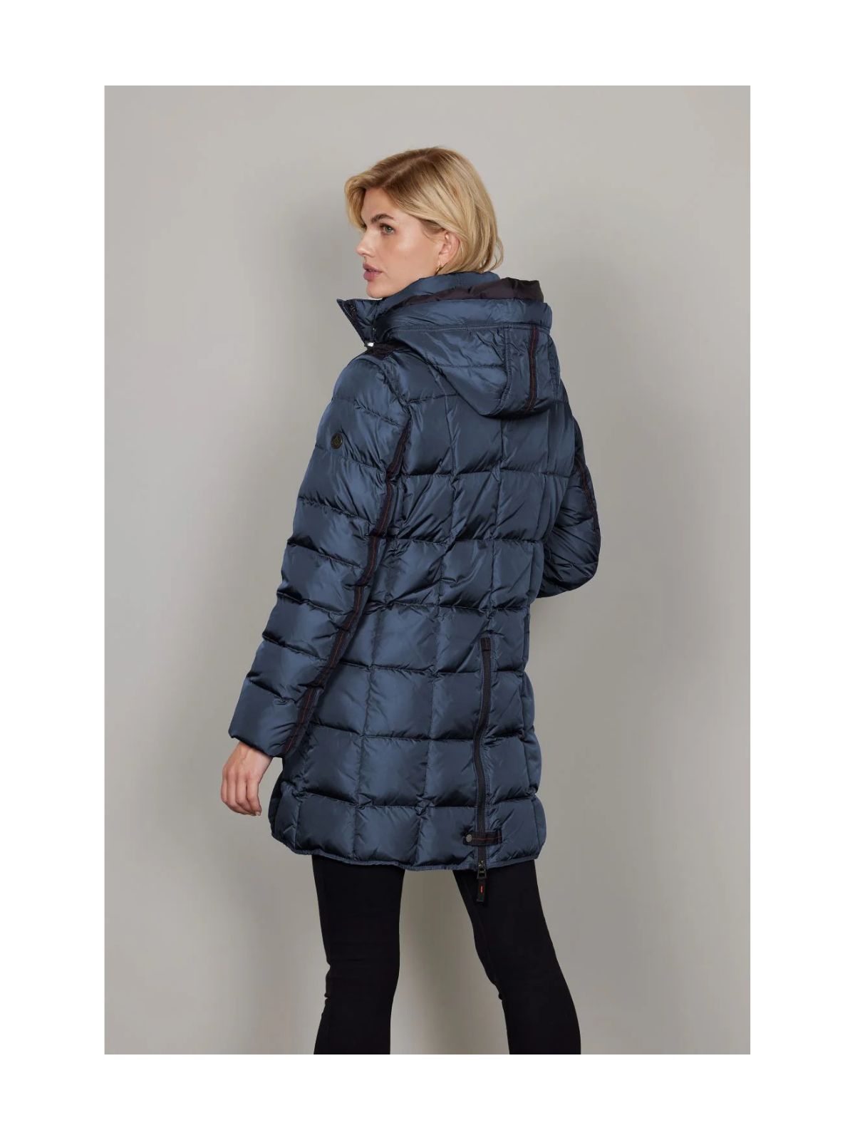 En sofistikeret og detaljerig dunjakke i fire lag med elegant kontrast og iøjnefaldende detaljer. Det let skinnende, vandafvisende stof og markante bånddetaljer giver et eksklusivt look med høj funktionalitet. Sorte bånd med kontrastsyede orange stikninger ved lommerne tilfører et moderne touch. Jakken lukkes med lynlås og trykknapper foran, har lynlåsslids bagpå for bevægelighed og en aftagelig hætte.Materiale: 100% Nylon | Foer: 100% Polyester | Fyld: 90% Dun, 10% Fjer