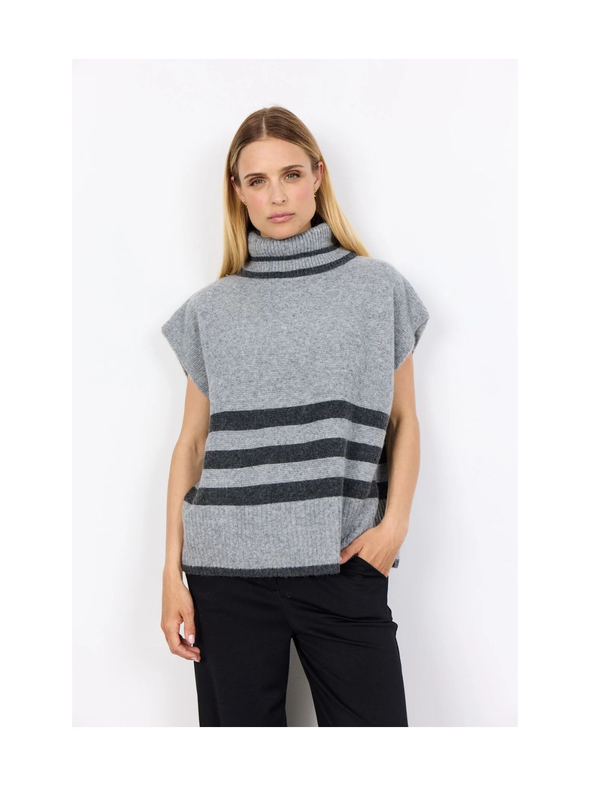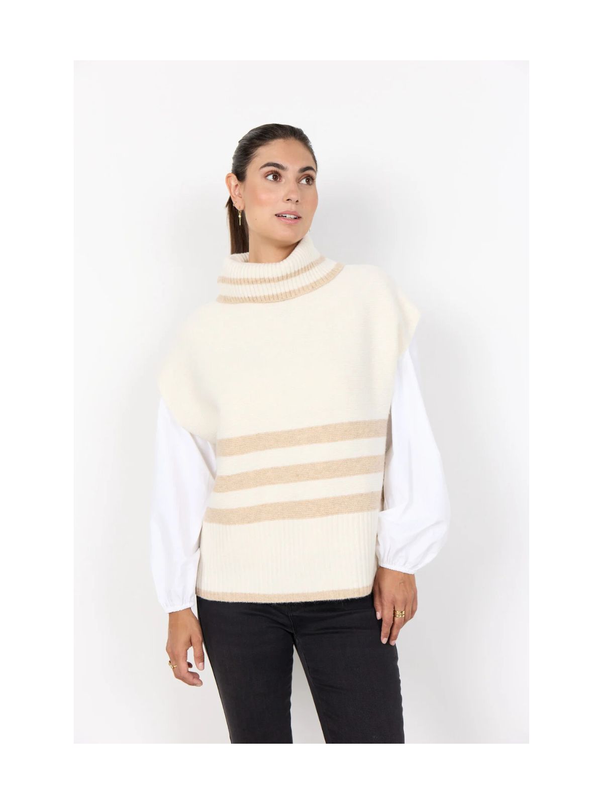 Strikket vest med et elegant stribemønster og struktureret design. Modellen har en høj ribkrave og korte ærmer, perfekt til at bruge over en langærmet top eller under en jakke for et stilfuldt lag-på-lag-look. Fremstillet i en blød og varm blanding af polyester, akryl, nylon, uld og elastan.Materiale: 65% Polyester, 13% Akryl, 13% Nylon, 6% Uld, 3% Elastan