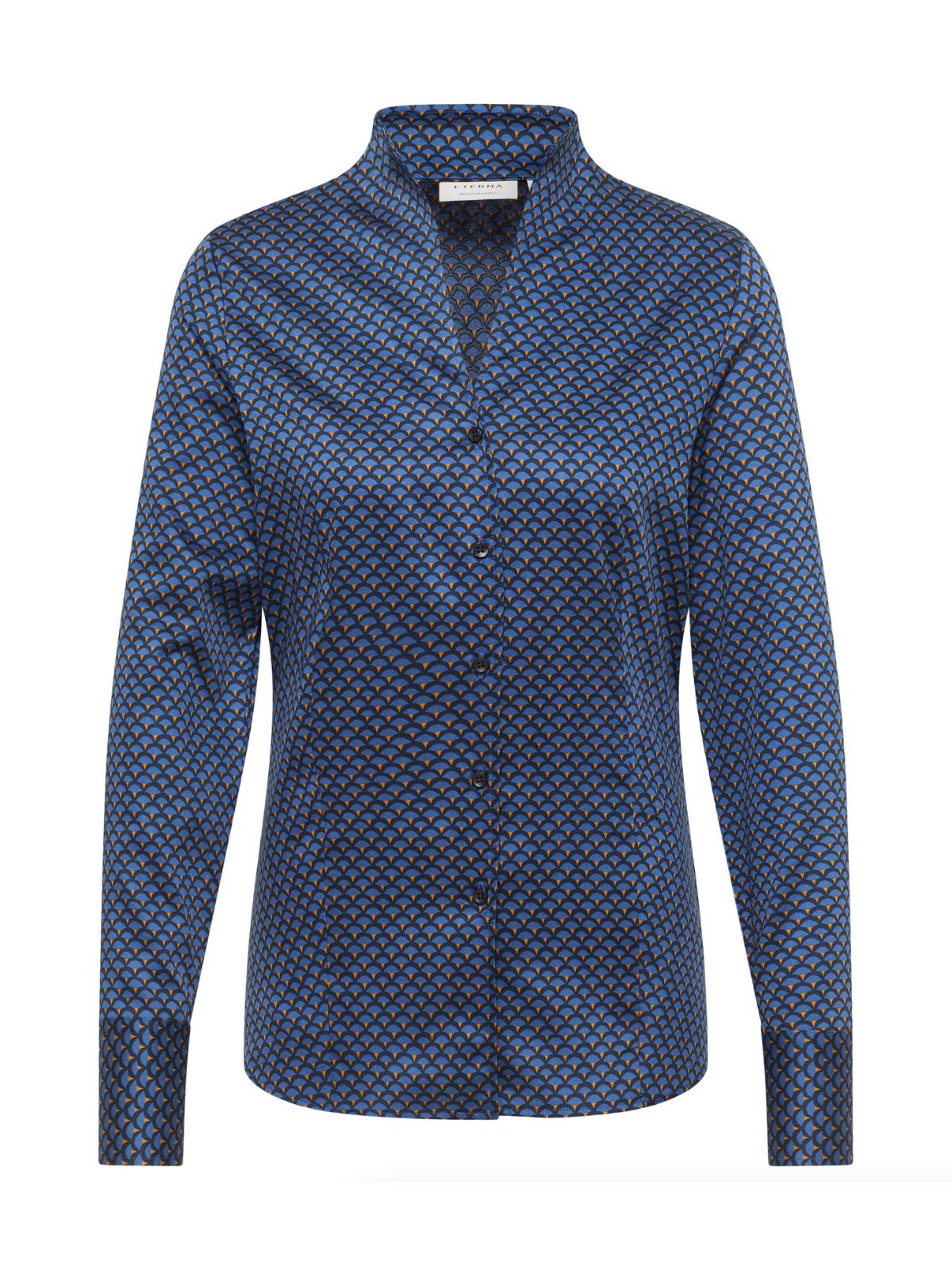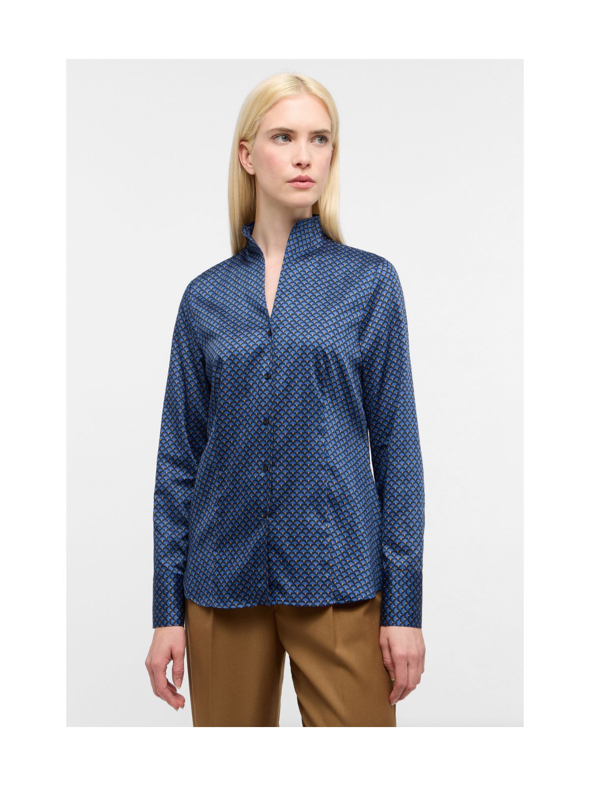 Du vil elske denne bluse i bomuldssatin med et diskret print! Det minimalistiske print kombineres med moderne detaljer som bægerkraven, en stående krave, der åbner let udad og også kan foldes ned. Blusen har regulært fit med en klassisk, skræddersyet og tætsiddende pasform, hvor læg i taljen fremhæver silhuetten.Materiale: 100% Bomuld