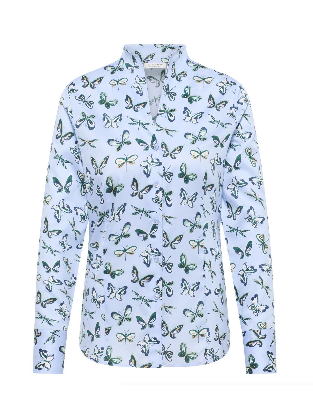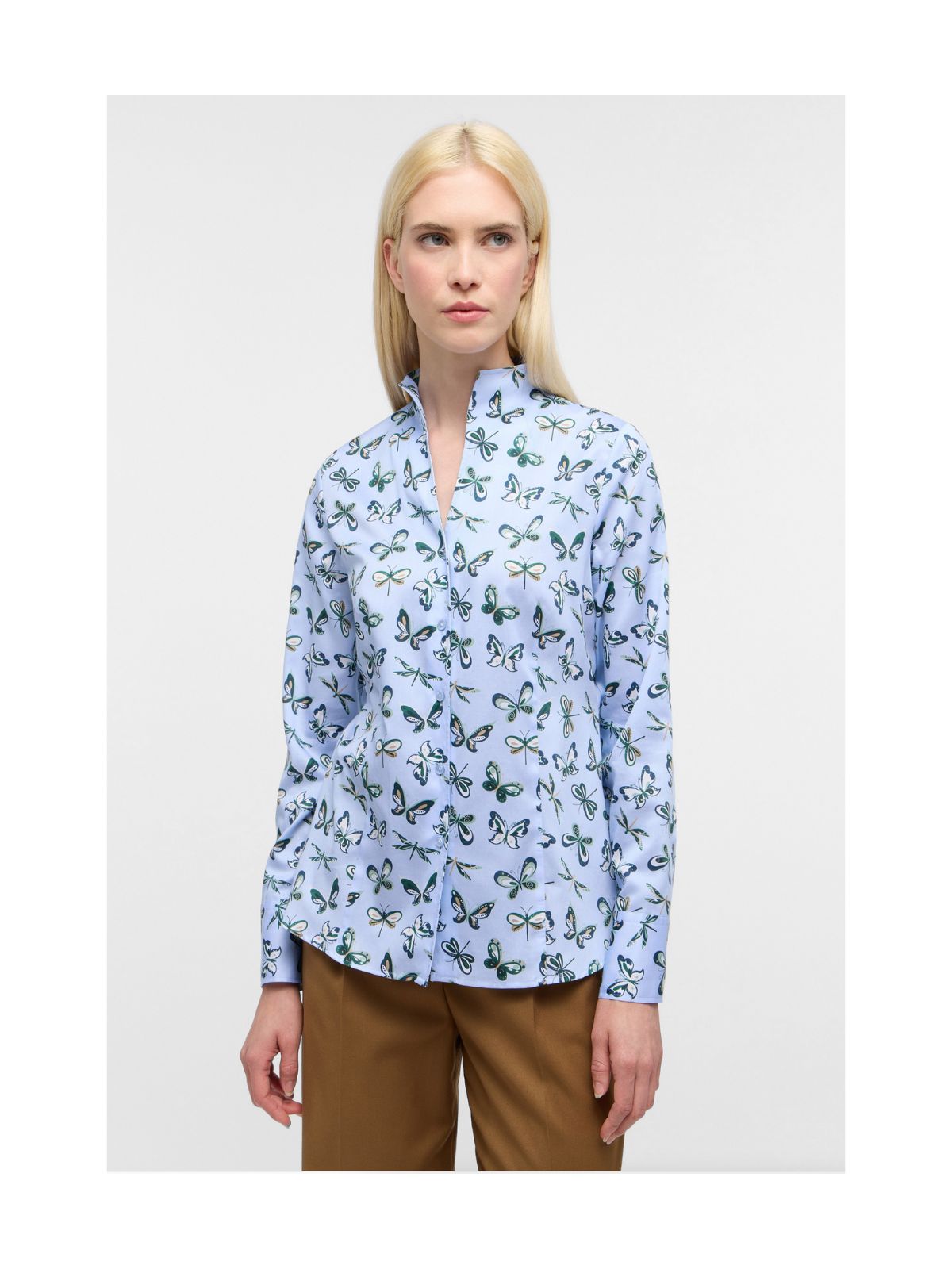 En feminin skjorte i blød, glansfuld bomuldssatin med et stilfuldt print af sommerfugle og guldsmede. Den let udstående, bægerinspirerede krave tilføjer et elegant touch, mens den figurvenlige silhuet med læg i taljen fremhæver figuren. Blusen er nem at passe og holder sig frisk og flot efter vask, hvilket gør den til et alsidigt og legende tilføjelse til enhver garderobe.Materiale: 100% Bomuld