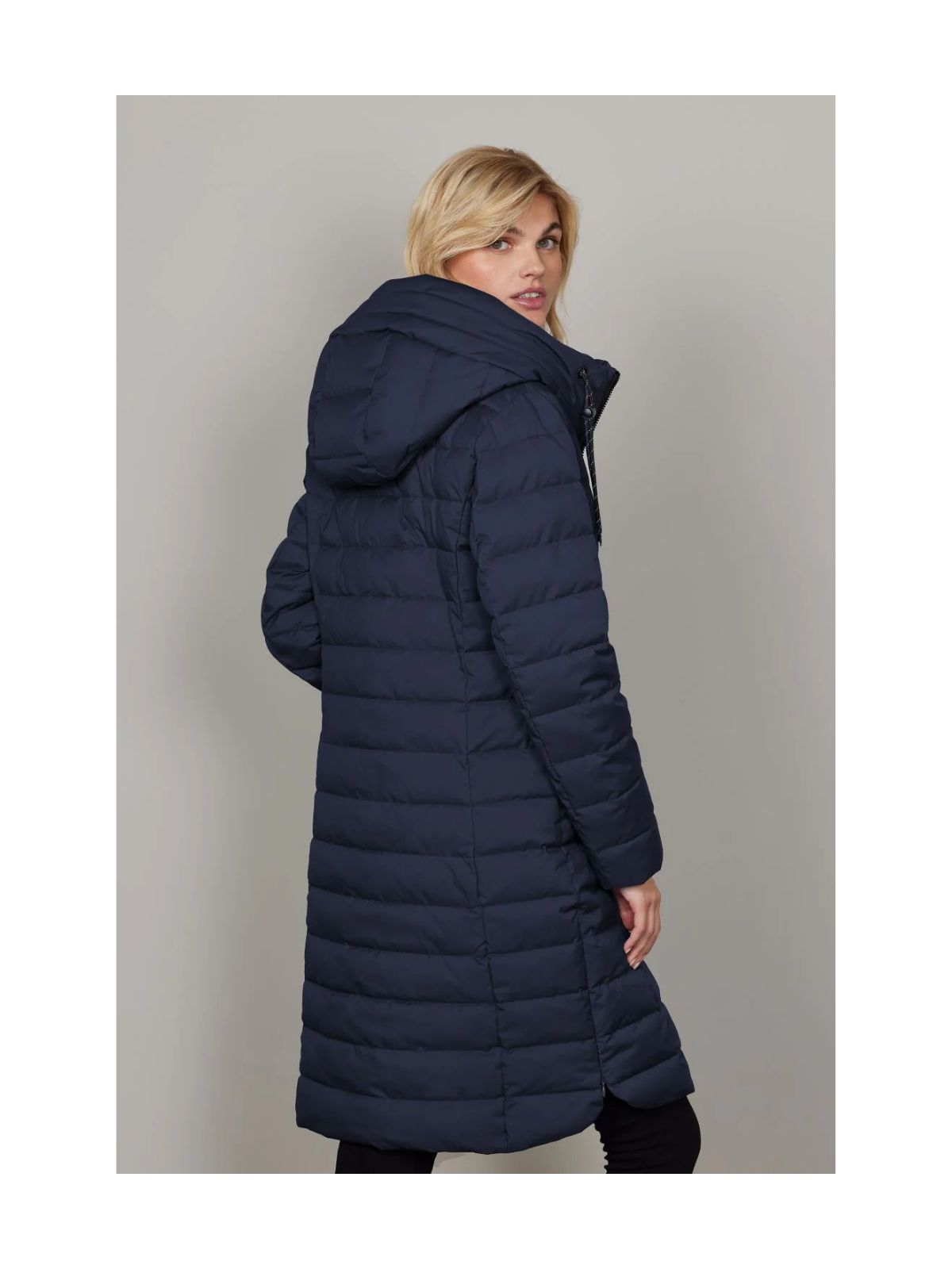 En lang, quiltet jakke med moderne dunlook, der kombinerer funktionel komfort med et elegant, urbant udtryk – perfekt til hverdagsbrug i overgangsperioder. Fremstillet i blødt polyester med mekanisk stræk og foret med Sorona®-vattering, som giver varme, åndbarhed og vind- samt vandafvisning (op til 3000 mm). Jakken har rummelig hætte med justerbar snøre, tovejs lynlås, lynlåslommer med varmt foer, inderlomme samt lynlåsåbning i sidesømmen for øget bevægelighed. Den let buede kant og moderne pasform fuldender det stilrene design.Materiale: 100% Polyester | Foer: 100% Polyester | Vattering: 100% Sorona polyester (dun alternativ)