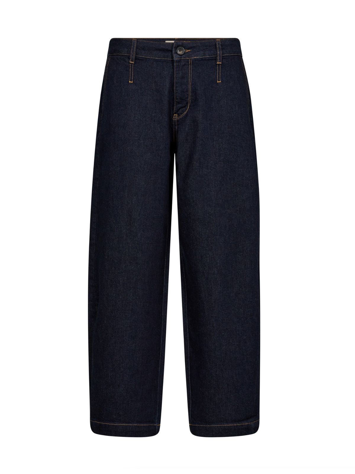 Disse chino-inspirerede jeans er et must-have denne sæson. De er designet i en afslappet mom fit med høj talje og en mørkeblå vask med kontrasterende tobakssyninger. Jeansene har klaplommer bagpå og giver et cool, ubesværet look, når de styles med en sweatshirt i en frisk farve og et par sneakers.Materiale: 98% Bomuld, 2% Elastan