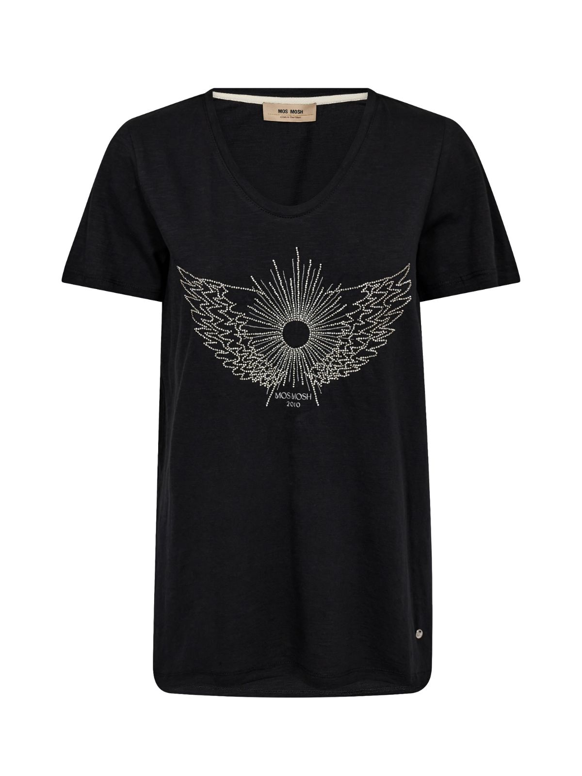 Smart t-shirt fra Mos Mosh. T-shirten har en V-udskæring, korte ærmer og dekorative sten på fronten.Materiale: 100% Bomuld