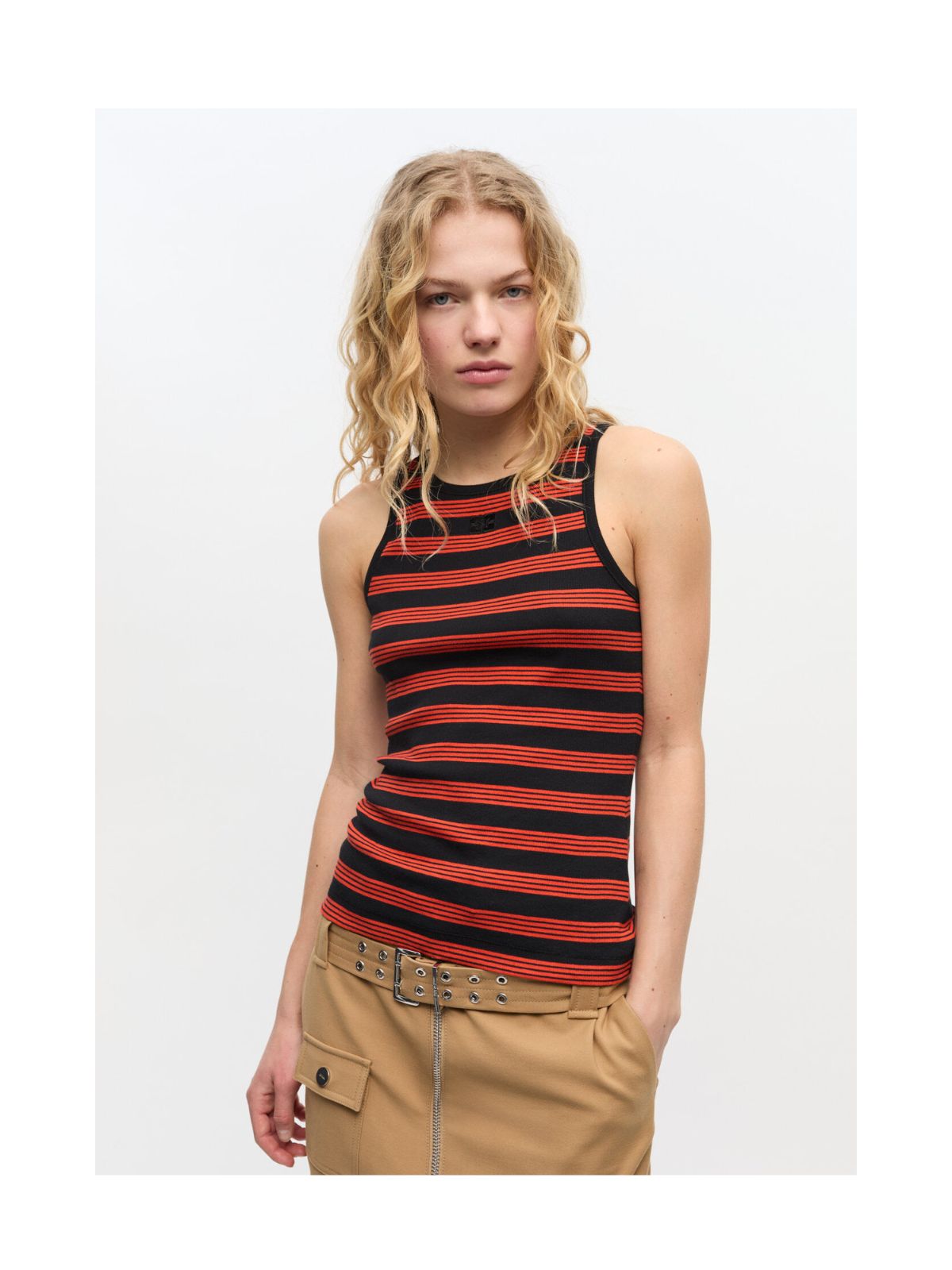 Denne top kombinerer komfort og stil med et rødt og sort stribemønster og et feminint bryderrygdesign. Den er ærmeløs med rund halsudskæring og detaljeret med GANNI Butterfly-logo, hvilket giver et subtilt, ikonisk præg.