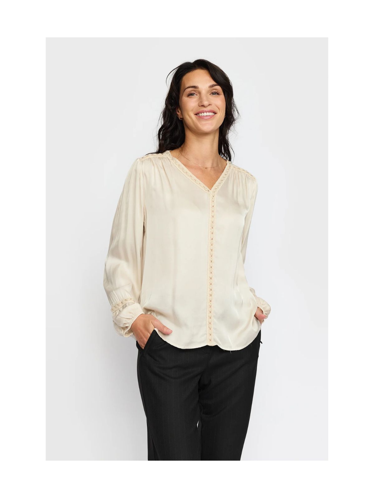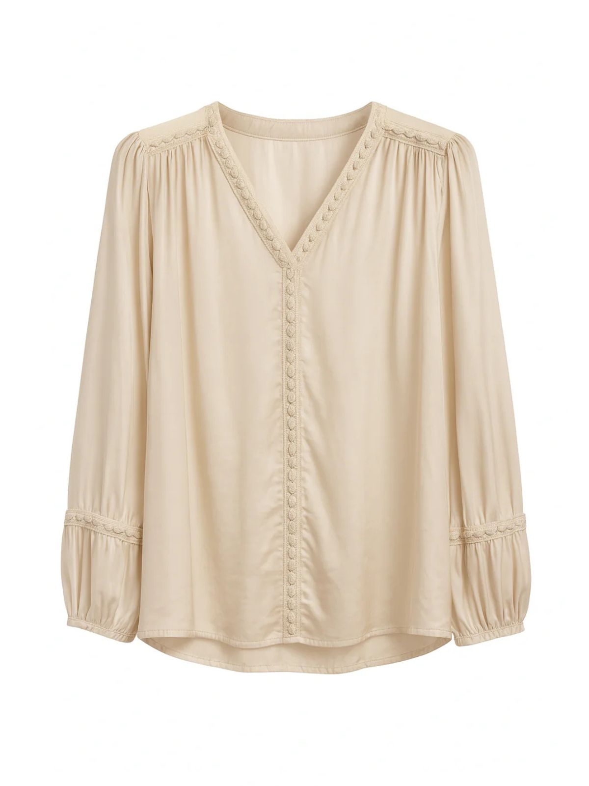 Bluse med lange ærmer med elastik forneden, V-udskæring og elegante guldfarvede bånddetaljer, der tilføjer et feminint touch.Modellen er 176 cm høj og bærer størrelse medium.
