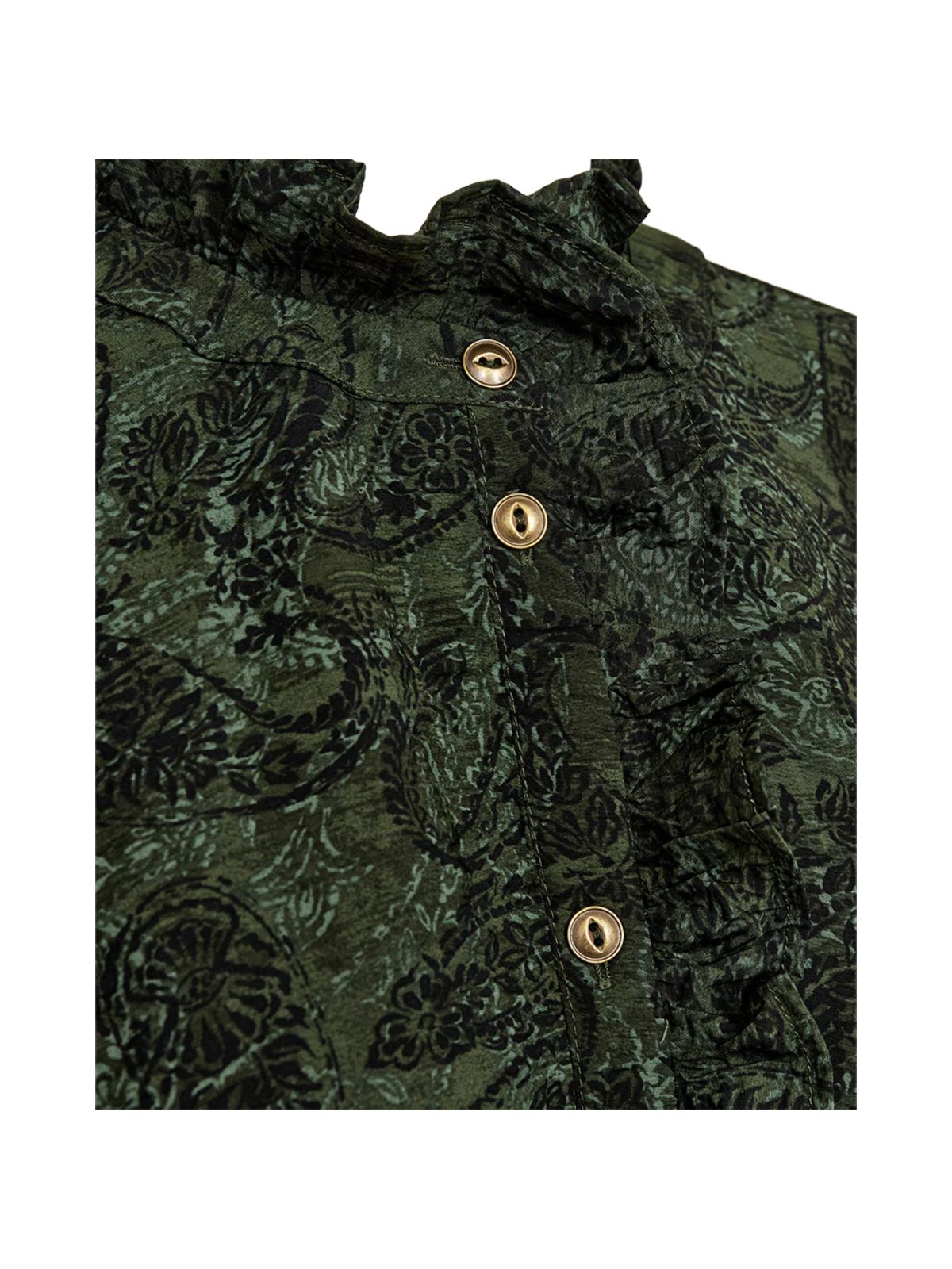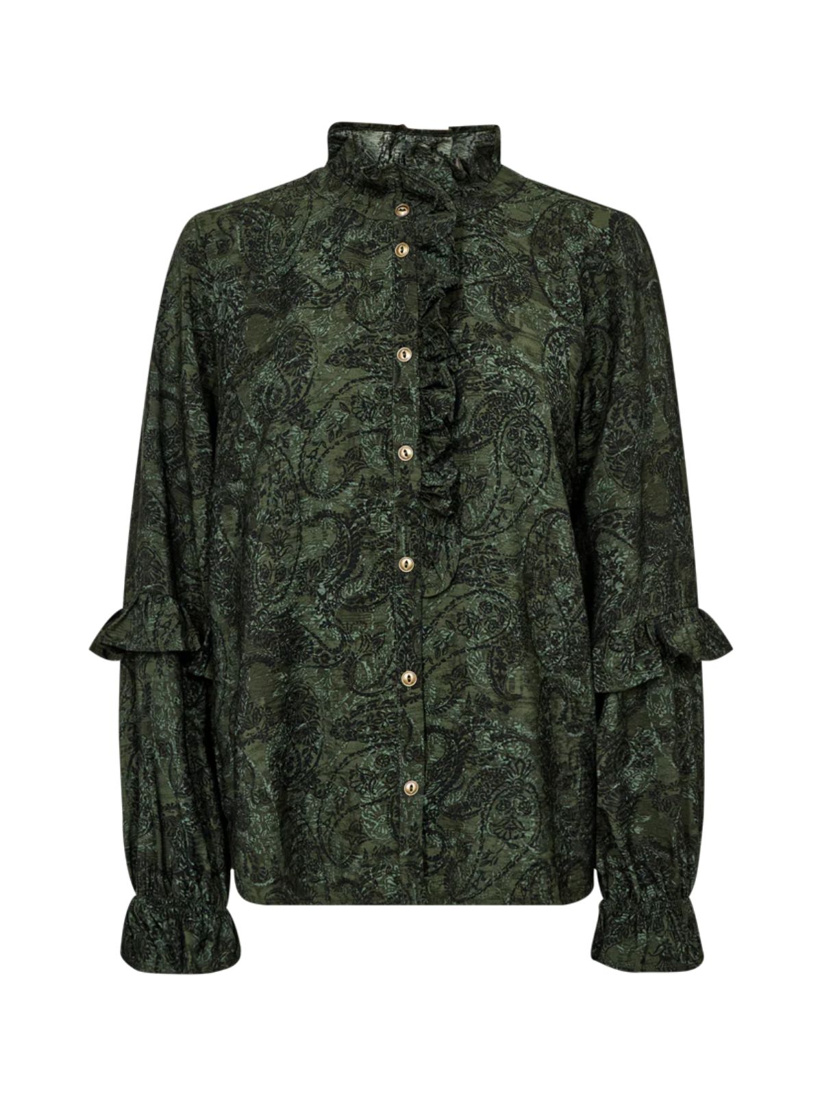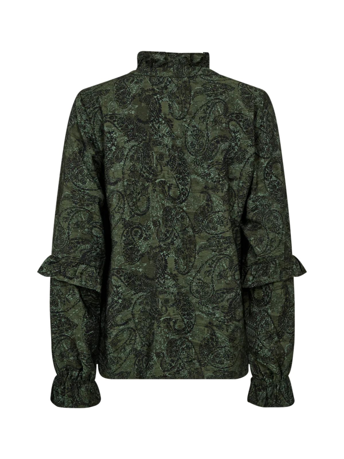 Bluse fra Freequent i en luksuriøs kvalitet med et elegant paisley-print og feminine flæsedetaljer, der pryder kraven, knaplukningen og ærmerne. De lange ballonærmer afsluttes med elastiske manchetter, mens den lette A-facon og slids i siderne giver blusen et luftigt og sofistikeret udtryk.Materiale: 88% Viskose, 12% Polyamid
