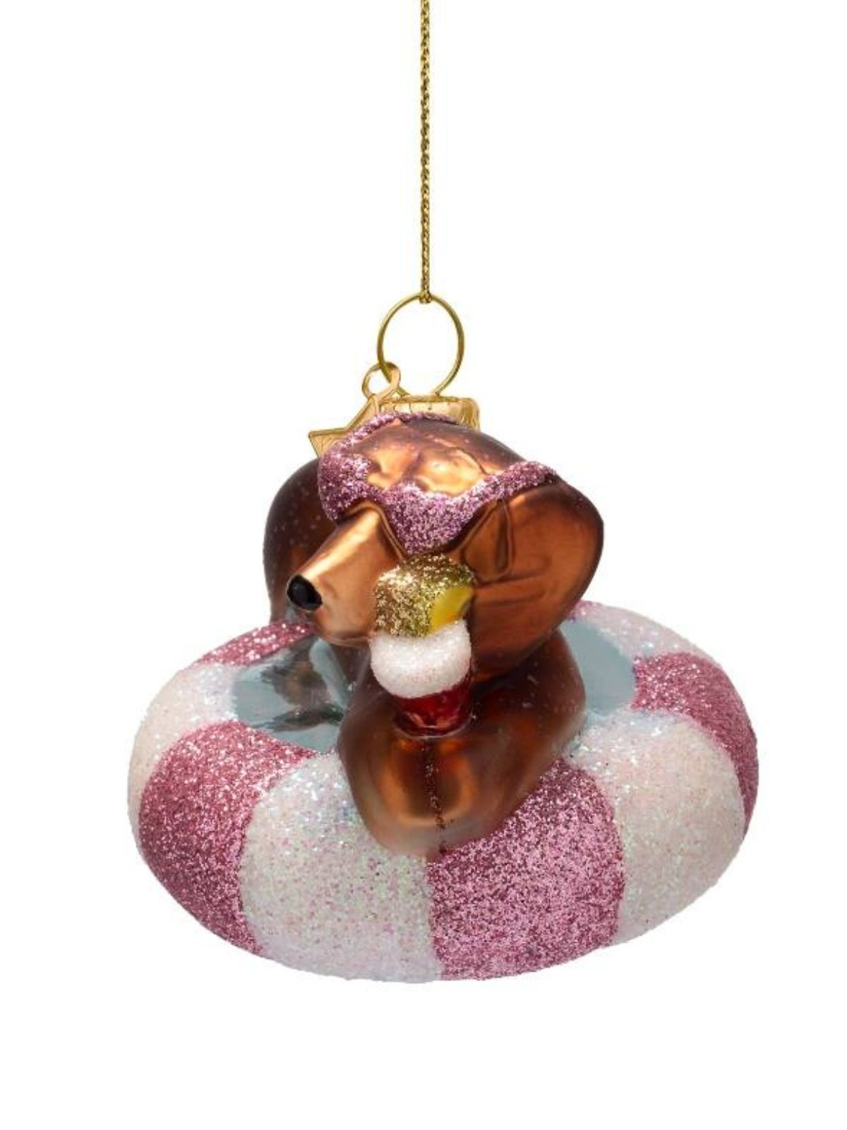 DOG ON POOL FLOAT fra Vondels' er julekugler lavet af glas, mundblæst, håndmalet og dekoreret med den største omhu. Hvert stykke er unikt! Vi bekymrer os om denne planet, og vi prioriterer brugen af miljøvenlige materialer.Mål: 6 cm