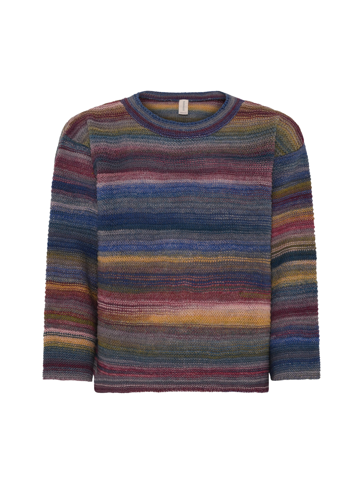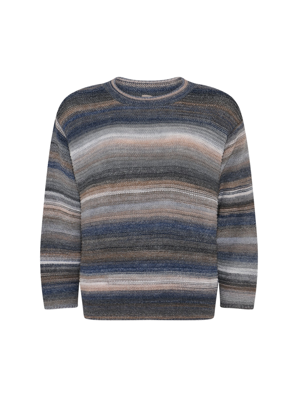 Denne flotte striktrøje har et smukt meleret mønster i harmoniske nuancer, der giver et unikt og moderne udtryk. Den bløde kvalitet og klassiske rund hals gør den perfekt til både hverdagsbrug og afslappede dage. En tidløs favorit, der kombinerer komfort og stil.