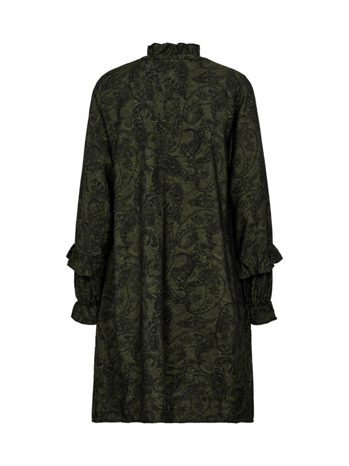 Kjole fra Freequent i en luksuriøs kvalitet med et smukt paisleyprint. Kjolen har en feminin silhuet med lange ballonærmer med elastik, fine flæsedetaljer ved kraven, langs knaplukningen og på ærmerne. De diskrete sidelommer og slids i siderne fuldender designet og giver et elegant, let fald.Materiale: 88% Viskose, 12% Polyamid