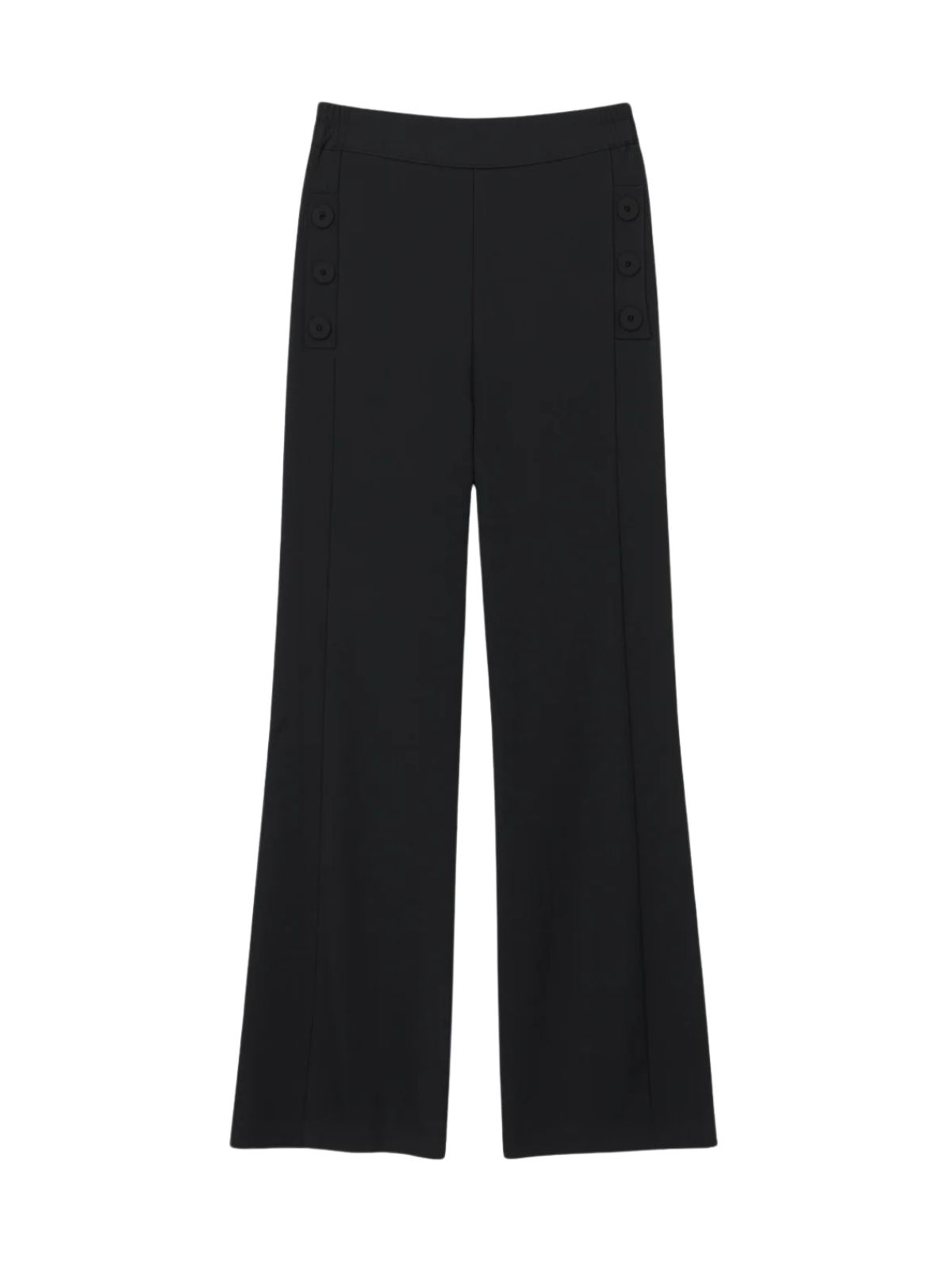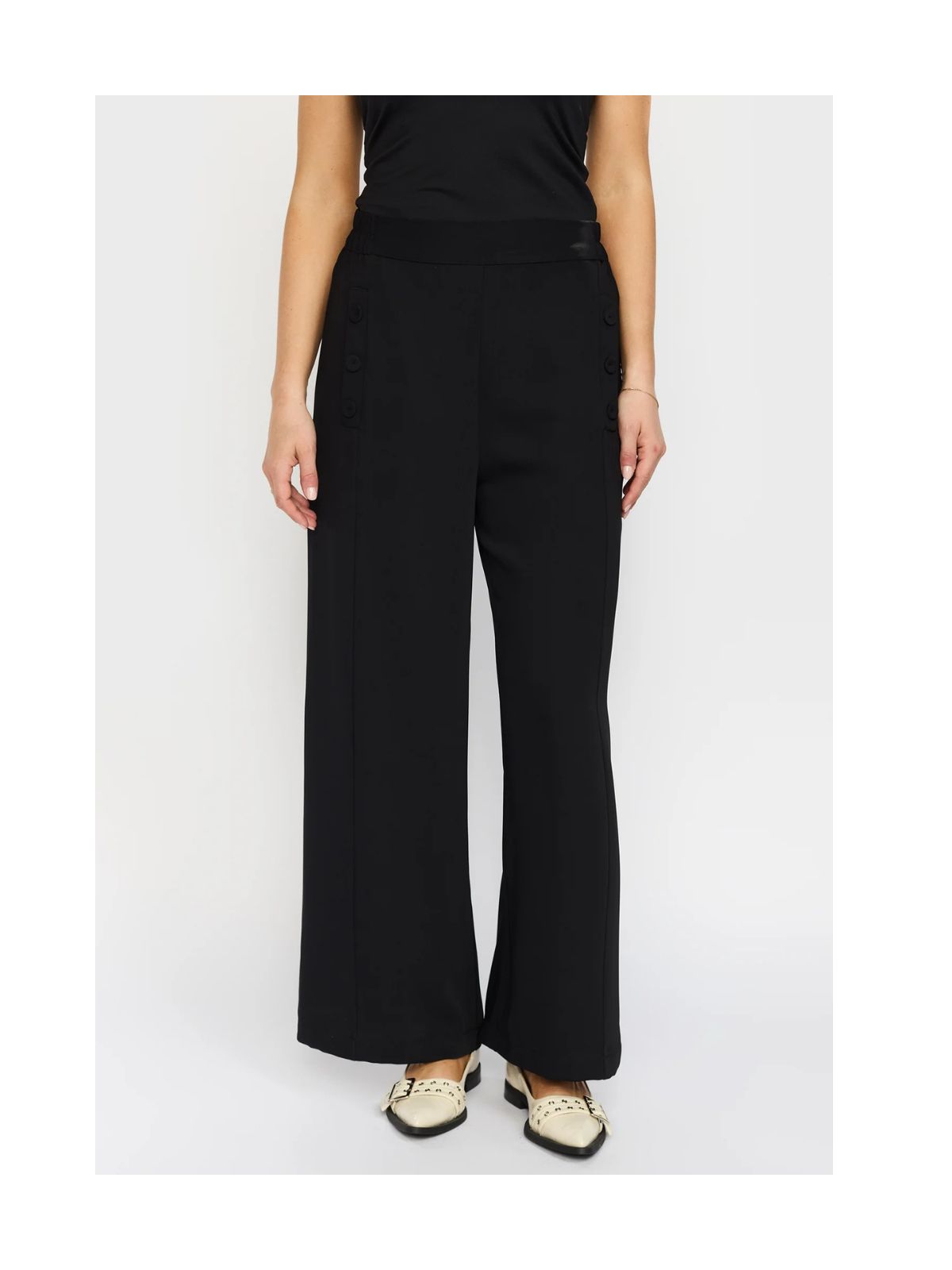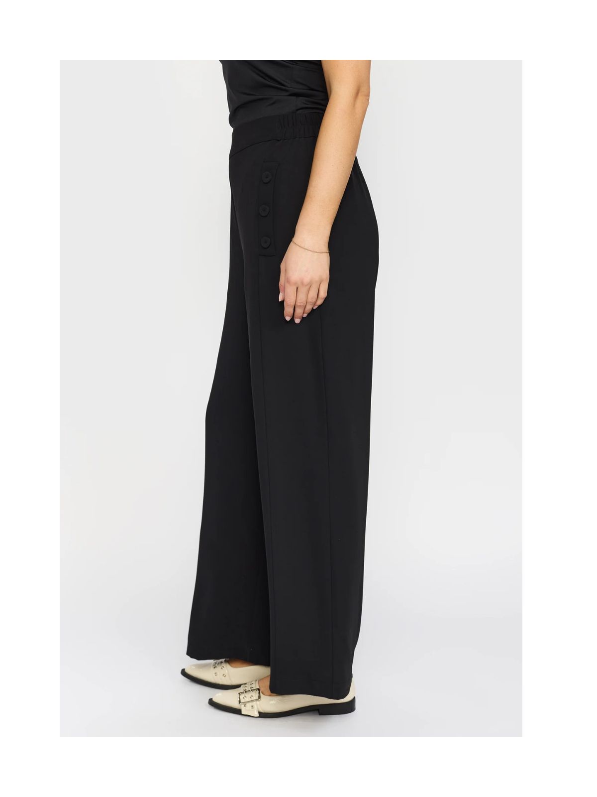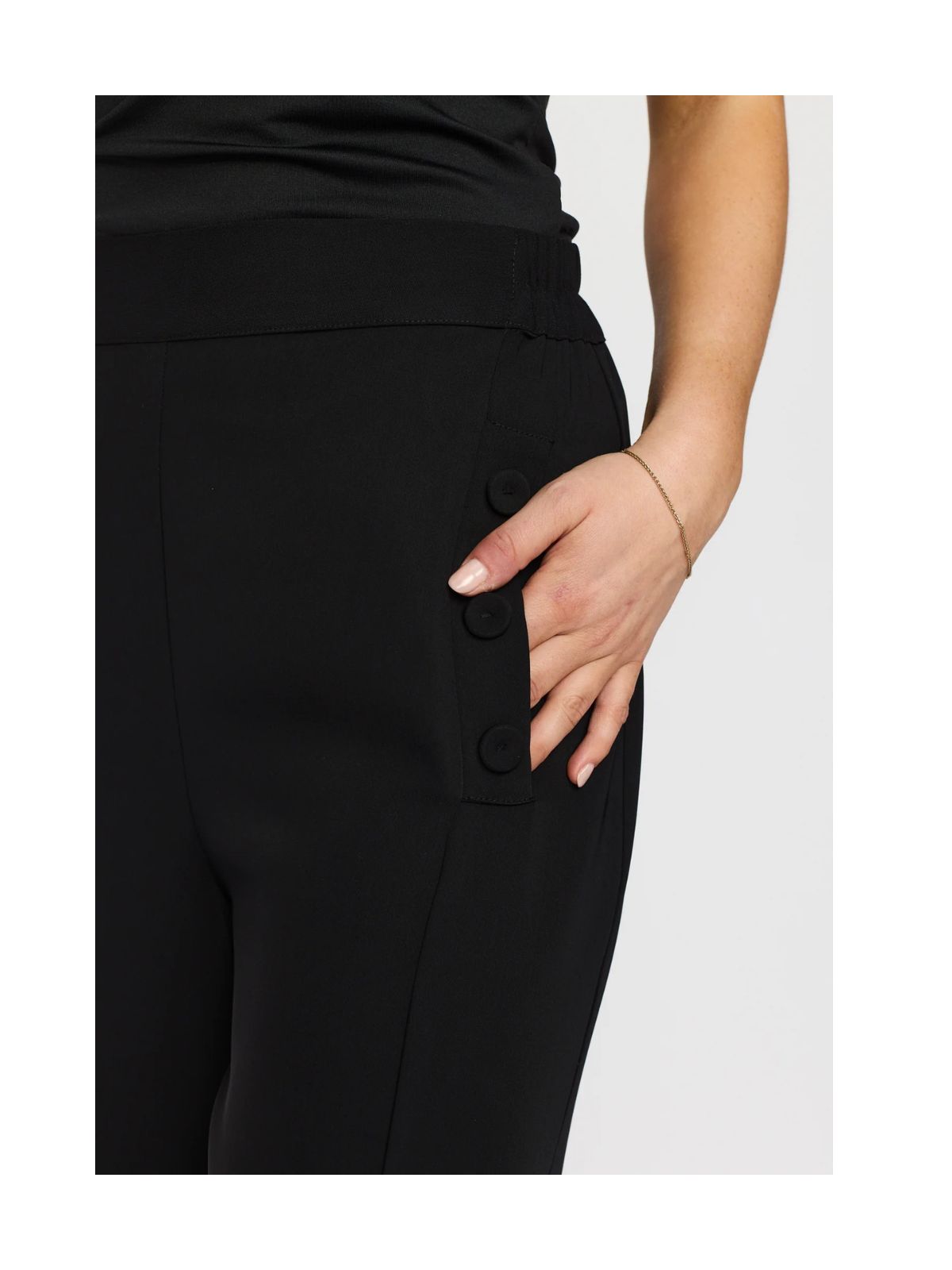Smukke bukser med lommer og dekorative knapper. Modellen har brede ben og elastik i taljen, hvilket giver en behagelig og flatterende pasform. Et elegant valg til både hverdag og fest.