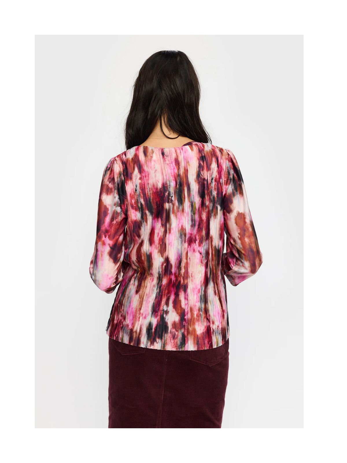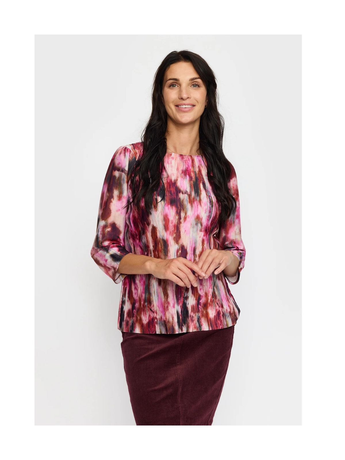 Bluse med trekvartlange ærmer og rund halsudskæring i let plisséstof med smukt farverigt mønster. Perfekt til både hverdag og festlige lejligheder.